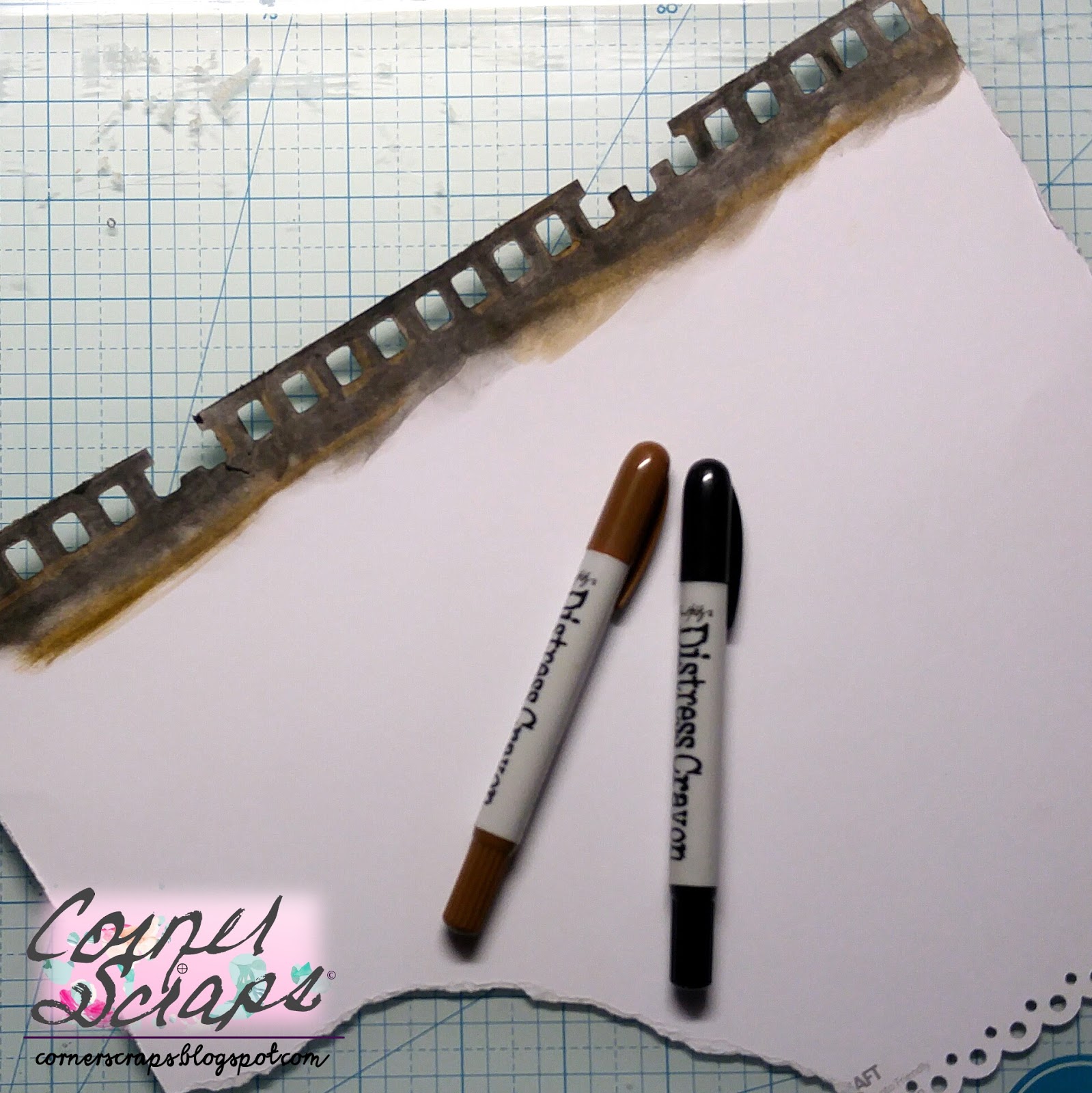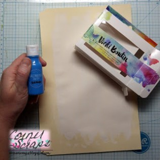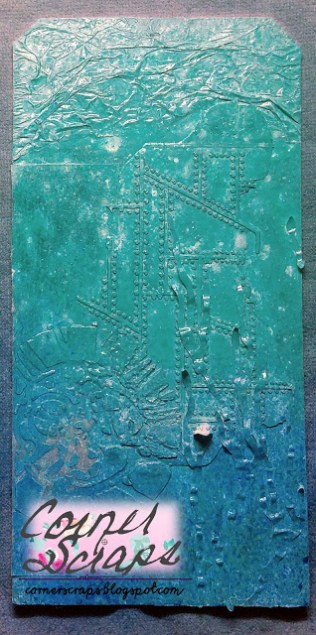 For my mermaid’s tail I used 140# watercolor paper, ran it through my Sizzix Big Shot using Tim Holtz’s Riveted Metal Embossing Folder, then used a glue stick to randomly give adhesion points for the Foil Transfer Sheets by Ranger (Vintage pack).
