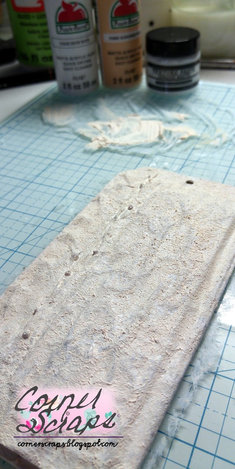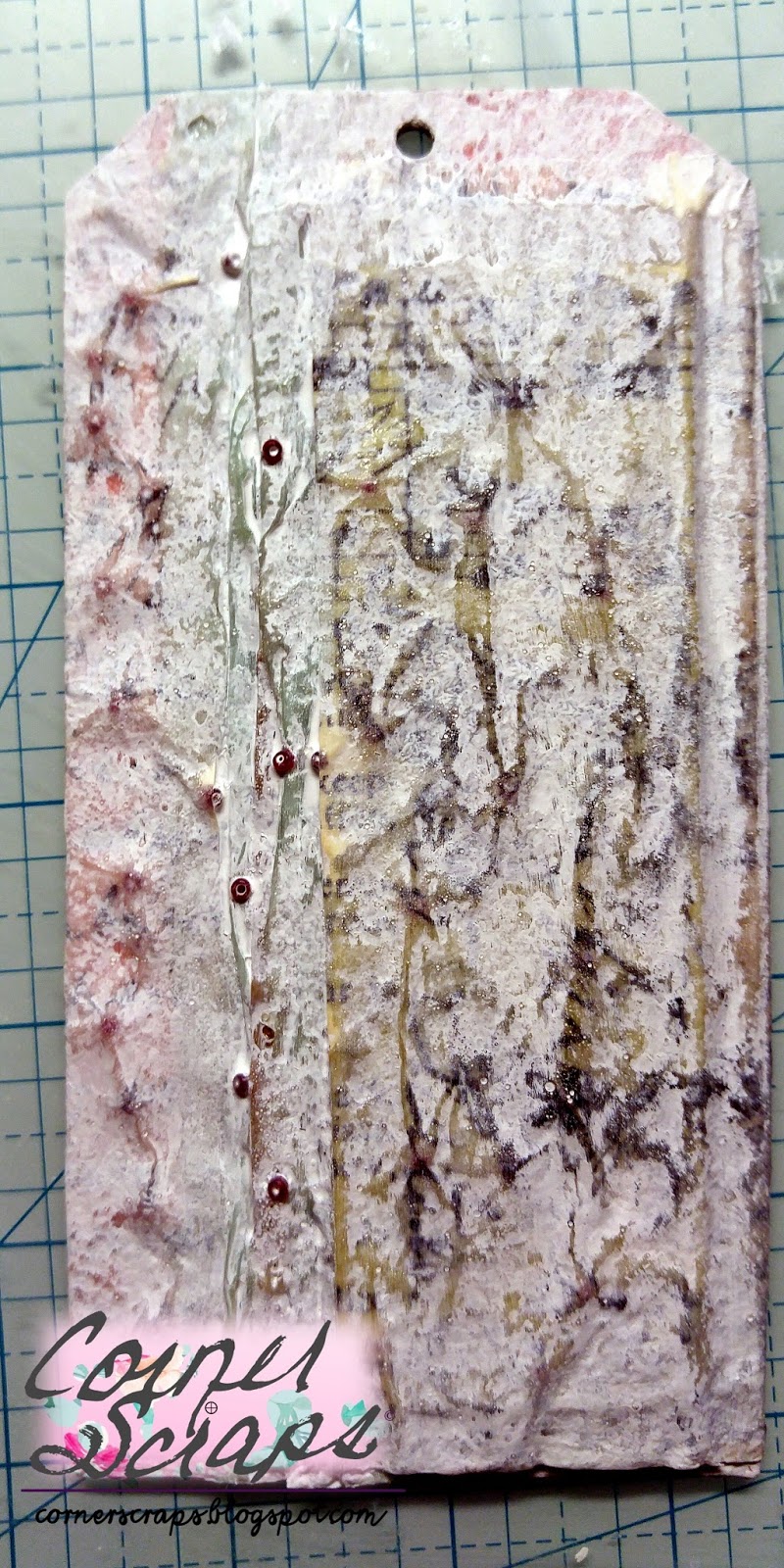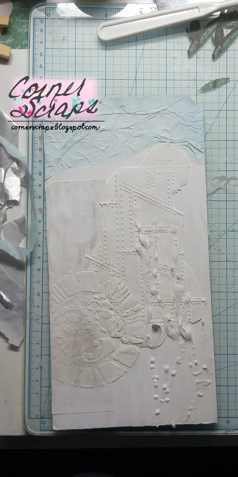 I started out with a #12 tag that I made using some think chipboard and an industrial paper trimmer! (The hubs used to use it to cut aluminum for seamless eaves-troughs AKA: the gutters on your roof!) I glued down some tissue paper, my “sheet-metal,” a bit of paper, and some of my seaweed. I added my texture paste clock, then gave it all a good coat of white gesso.