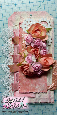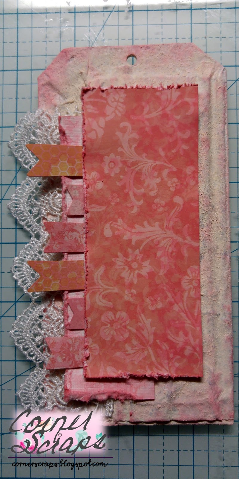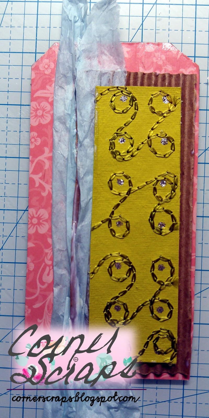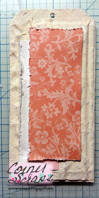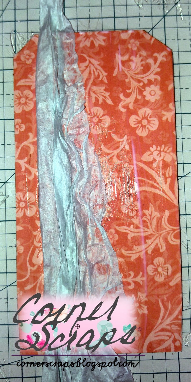I started out with a #12 tag that I made using some think chipboard and an industrial paper trimmer! (The hubs used to use it to cut aluminum for seamless eaves-troughs AKA: the gutters on your roof!) I glued down some tissue paper, my “sheet-metal,” a bit of paper, and some of my seaweed. I added my texture paste clock, then gave it all a good coat of white gesso.