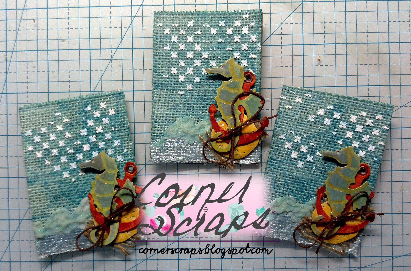 The seaweed was cut from a sheet of American Crafts White Vellum, and sprayed with Heidi Swapp’s Color Shine: Tinsel or a combination of Heidi Swapp Color Shine: Sweet Mint and Shimmerz Coloringz: Oh Say Can U Sea.