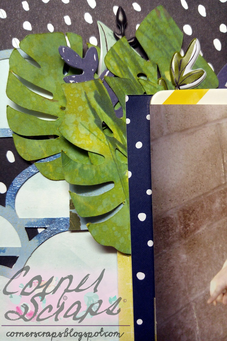 Instantly I knew what was going to happen to that green paper! I already had a set of photos in mind I wanted to scrap when these arrived, and it was lucky for me that green paper just screamed “turn me into tropical leaves!”. The floral paper, well that was going to have to be shaped to my will!