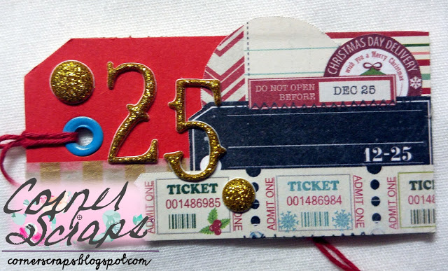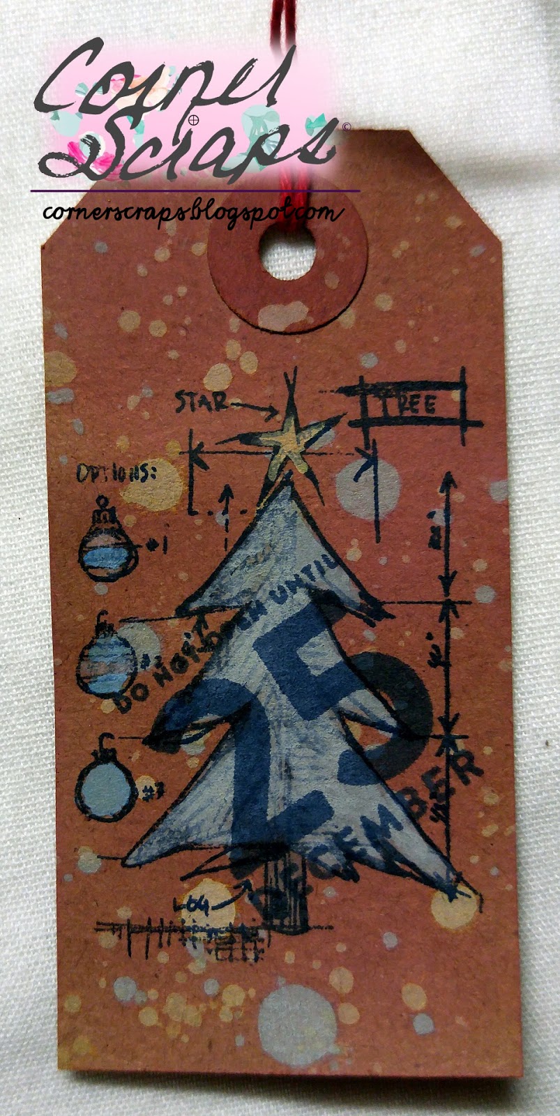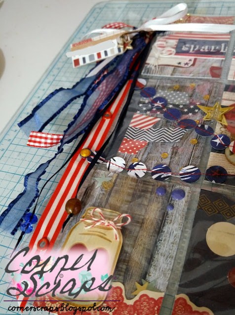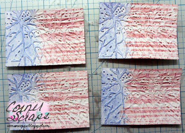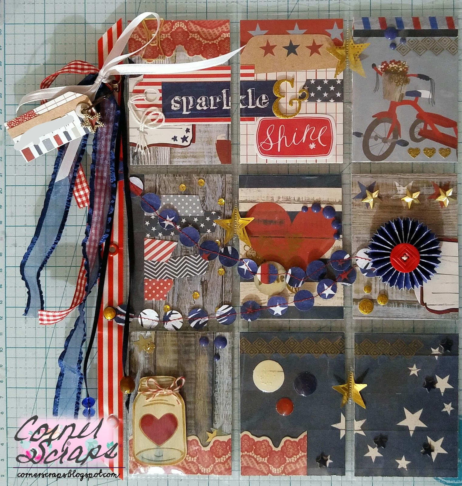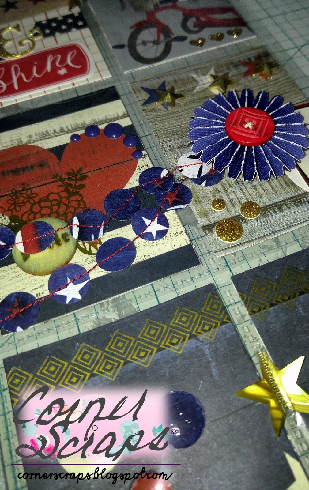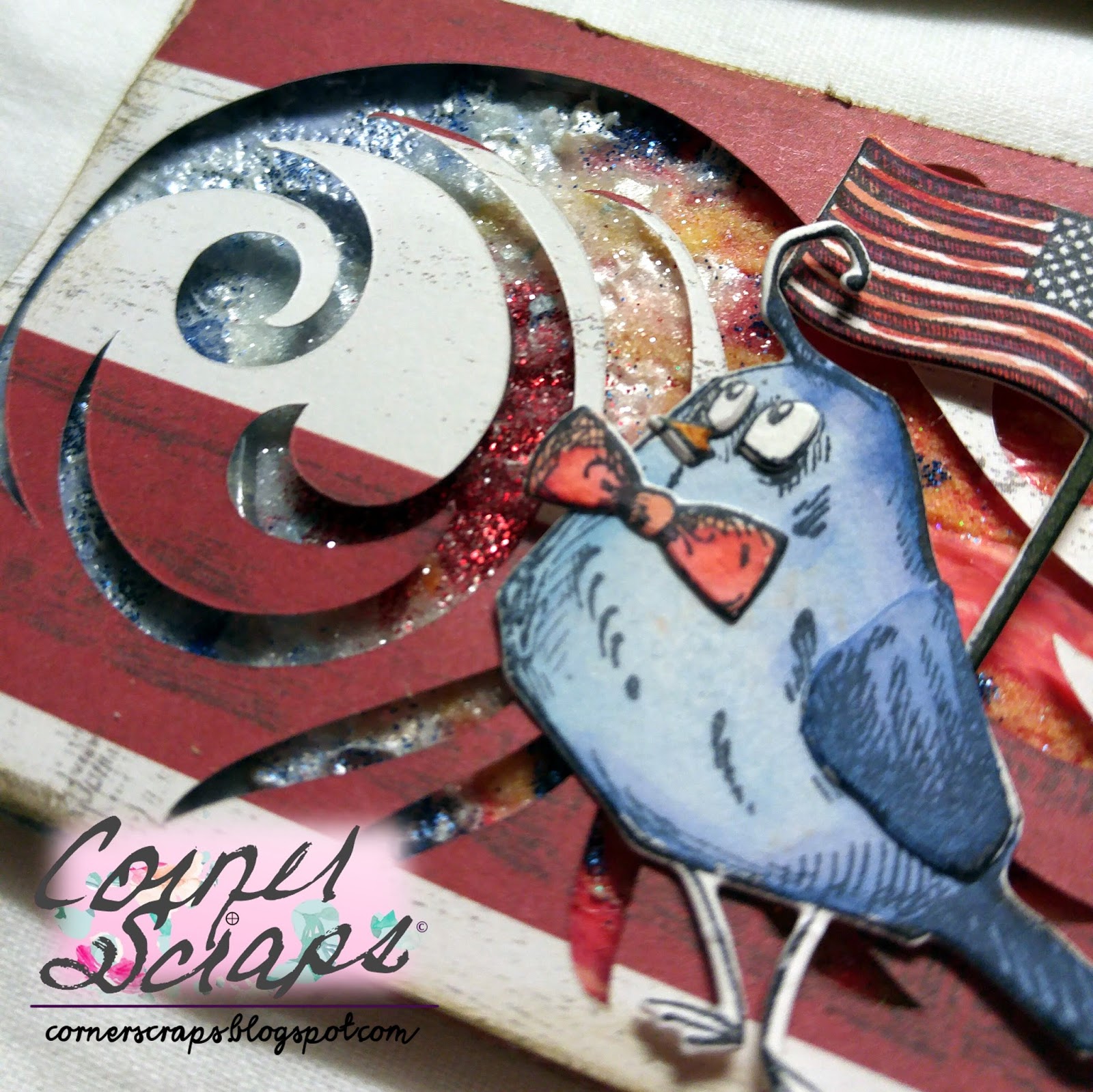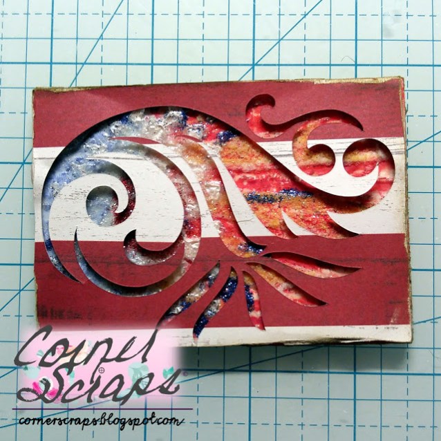 I actually threw the ATCs in the trash at this point, I just didn’t know what else to do! But, as I was sitting there thinking about what items to keep out for the next try I saw an old Tim Holtz Mask “Flourish” just hanging around collecting dust, and I had an idea! At first I was going to use the mask, but I hadn’t worked out what I would use to cover the undesirable areas. Then, as I sat there staring at the mask over the ATC next to my pile of scrap pieces of Simple Stories “Stars & Stripes” a firework went off in my mind! And the following picture is what that firework sparked!