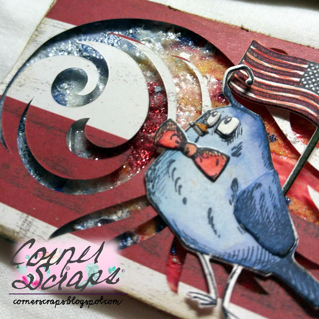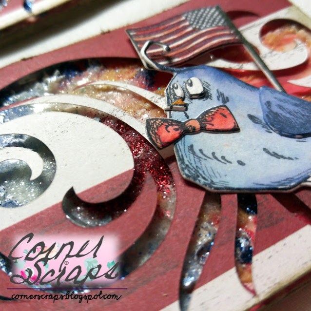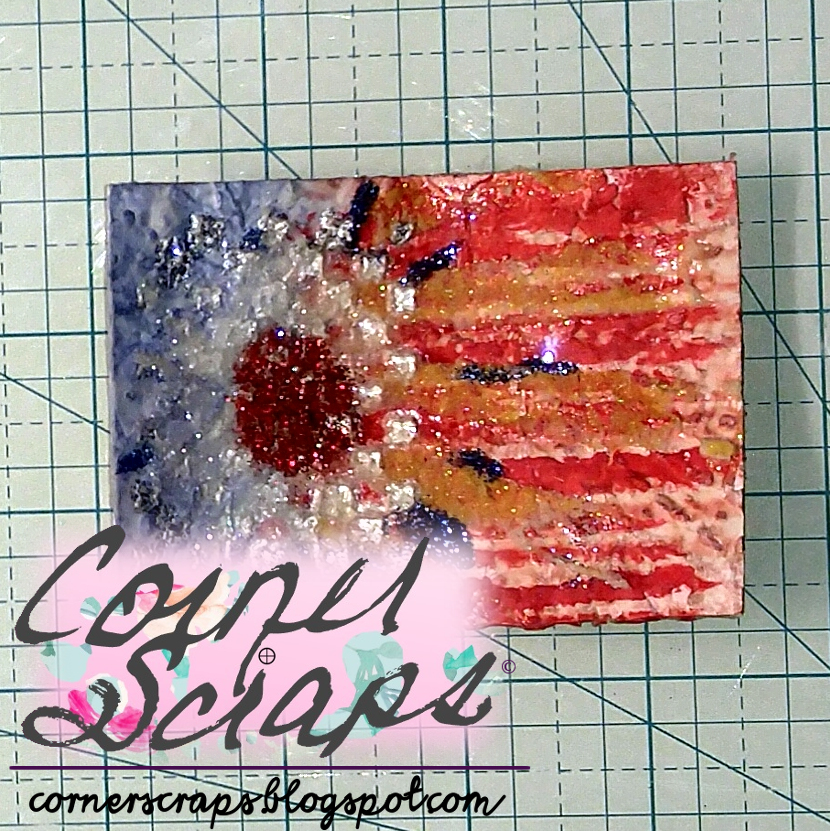 I decided to get Mixed Media crazy! I added Candied Apple Distress Paint stripes, I threw down a layer of Mod Podge, which “intensified” the Distress Oxides underneath, I added some Prima Snowflake Paste for those rays using Tim Holtz’s “Ray” stencil, and colored them with Shimmerz Vibez “Glorious Day.” If that wasn’t enough, for the “stars” I used Shimmerz Dazzlerz “Spun Sugar” and Echo Park’s “Beach Towel” stencil. About now I was thinking I should give up and start over! But, as I said, I’m persistent (some may say overly stubborn, but they’re wrong! LOL). Anyhow, I decided that I should cover some of my “flag” with a firework (as so originally inspired by the July Challenge at Creative Embellishments) and I dug out my glitter. (I have a great dislike for glitter, but I was getting desperate!)