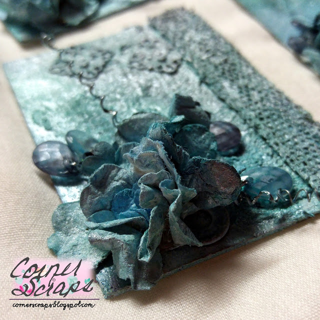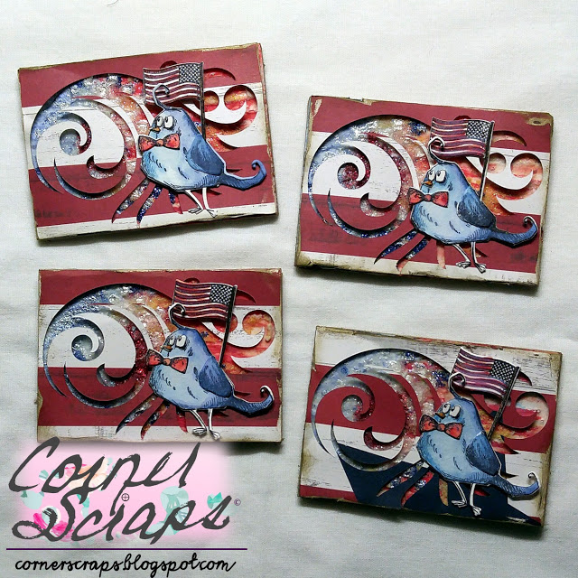 Using my hot glue gun I stuck the cuts to the ATCs, used the sanding block to distress the edges, and inked them up with some Frayed Burlap Distress Ink! There was still a little too much “stuff” showing, and that’s when I decided to enlist the help of a little birdie!