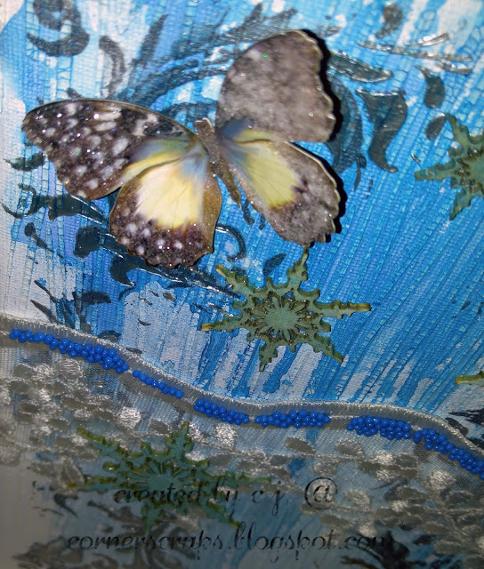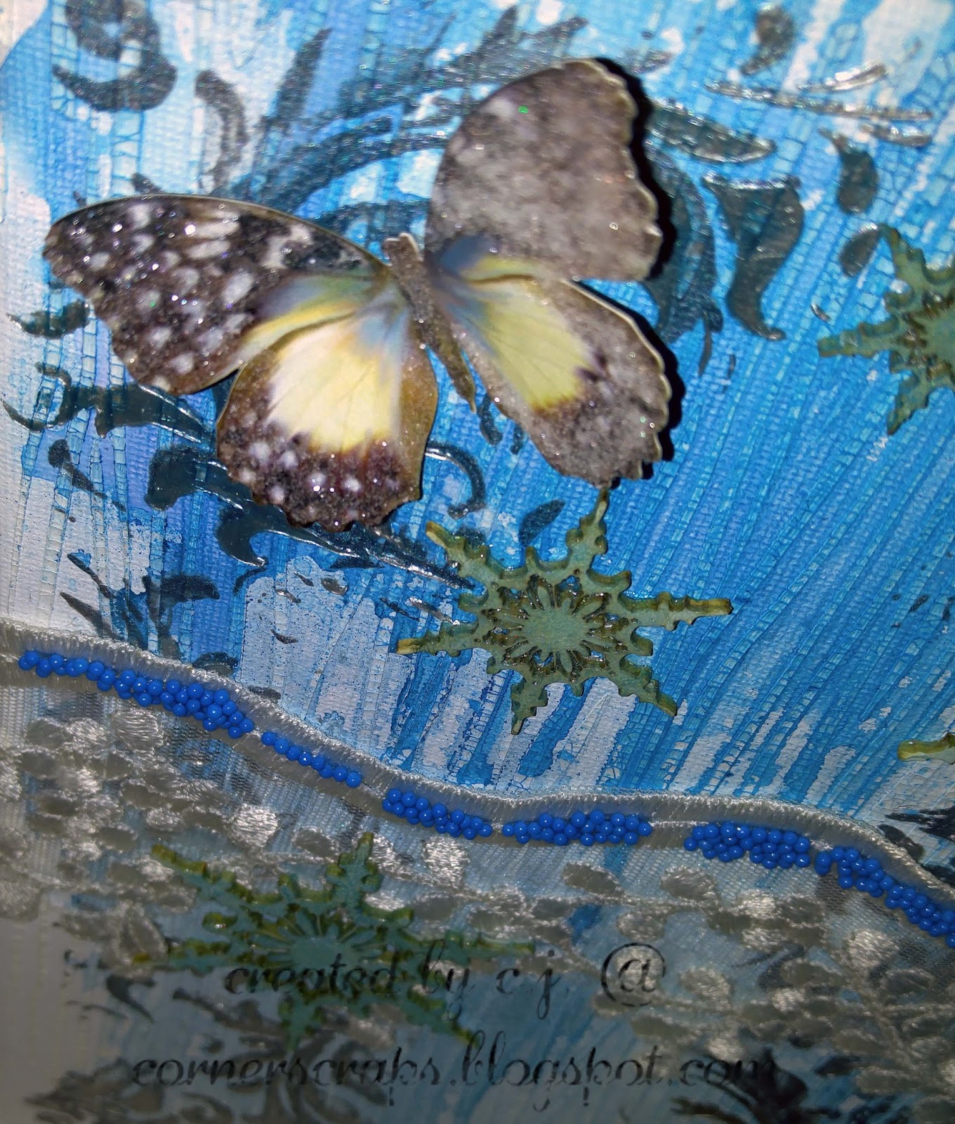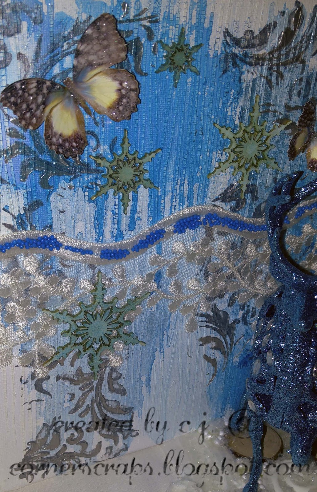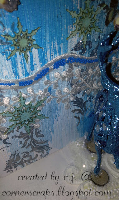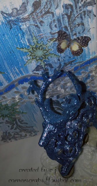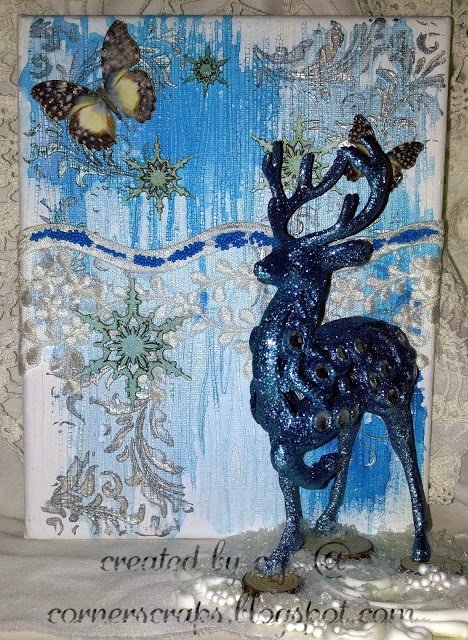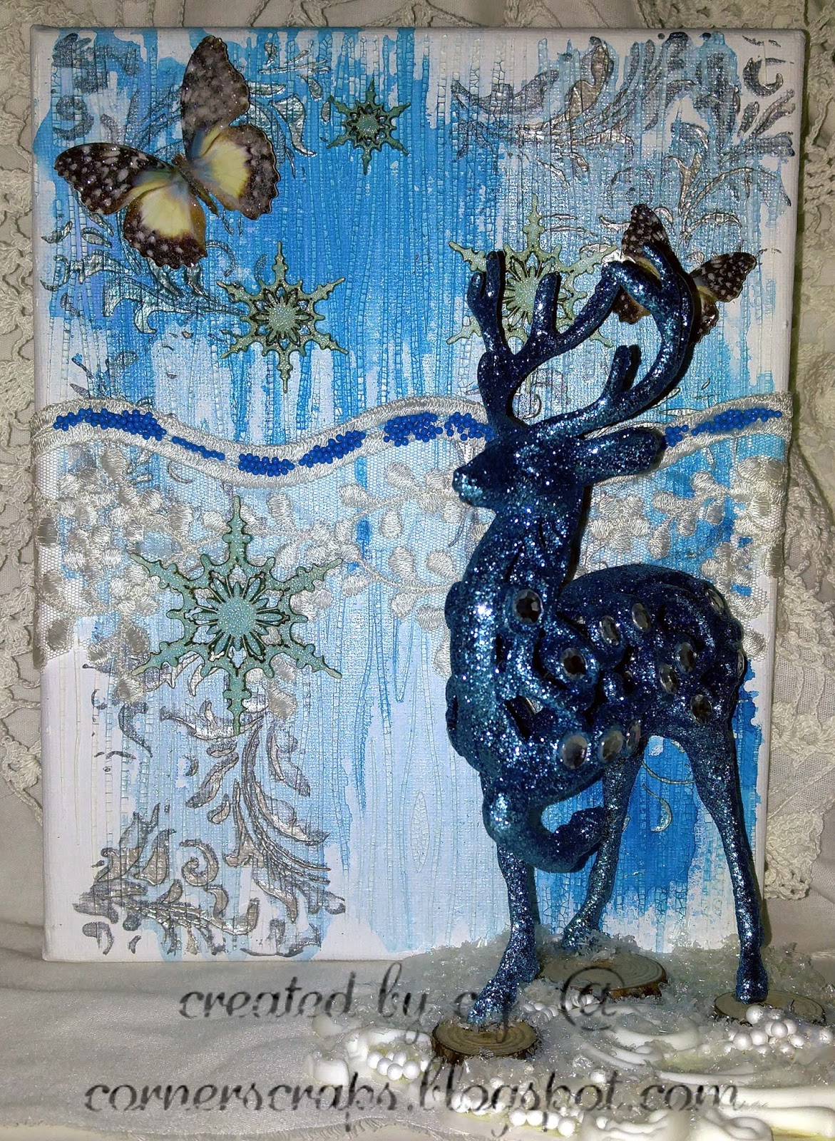 Recently I have been getting an urge to branch out and try my hand at Mixed Media canvas work. When I came across the deer at the 99¢ store I knew I had found what to try and work around! Plus, it went well with the December Challenge over at Creative Embellishments that had already put the idea of doing some winter work in my mind!