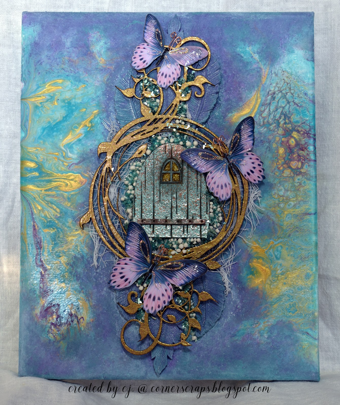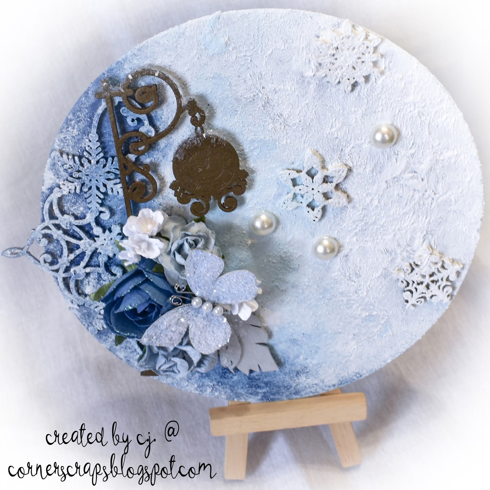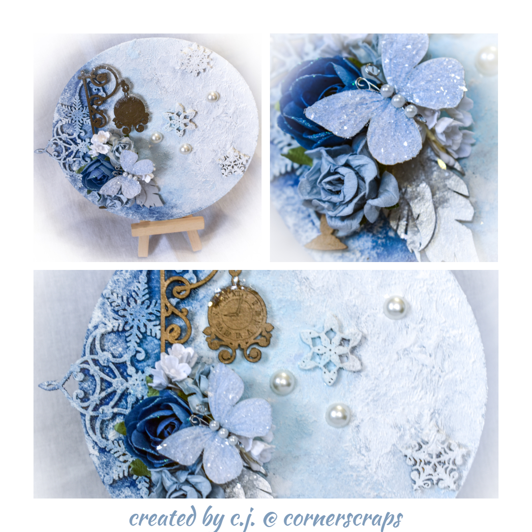 For the background I glued down some ReneaBouquet Beautiful Board – Beautiful Bits – Snowflakes & a Beautiful Board Snowflake Accent, then coated it all in Prima Royal Blue & Powder Blue Rust Effect Pastes. For the white paste I first put down some TCW Modeling Paste, then I topped it with more TCW Modeling Paste mixed with some Prima Paper Texture Paste + 13 @rts White Ayeeda Ink + some 13 @rts Magic Power. (All because I didn’t have a white grit paste like I thought I did!)