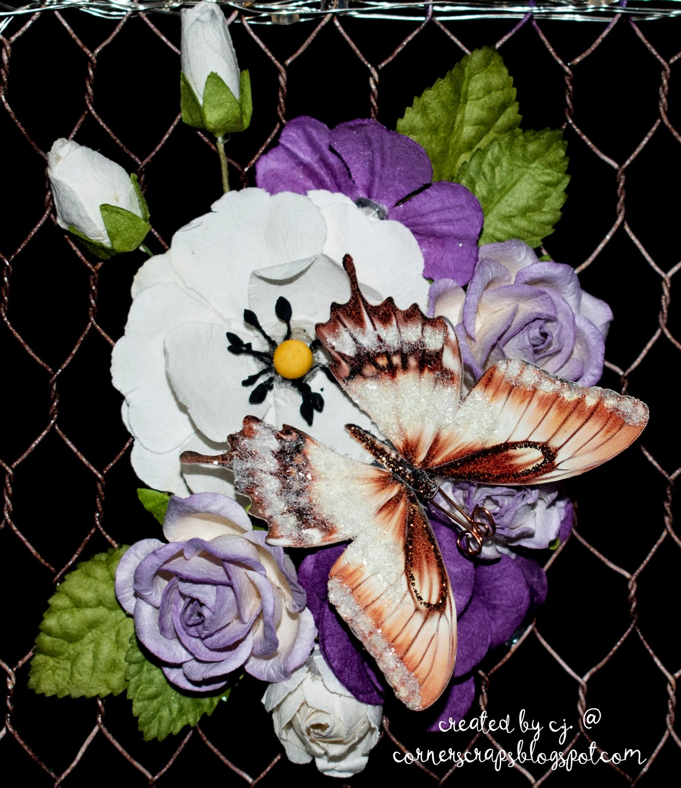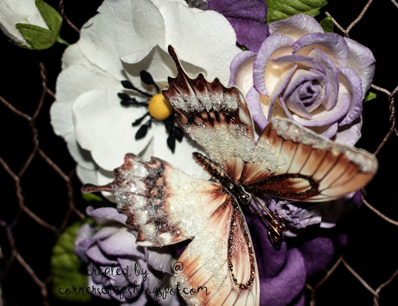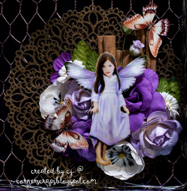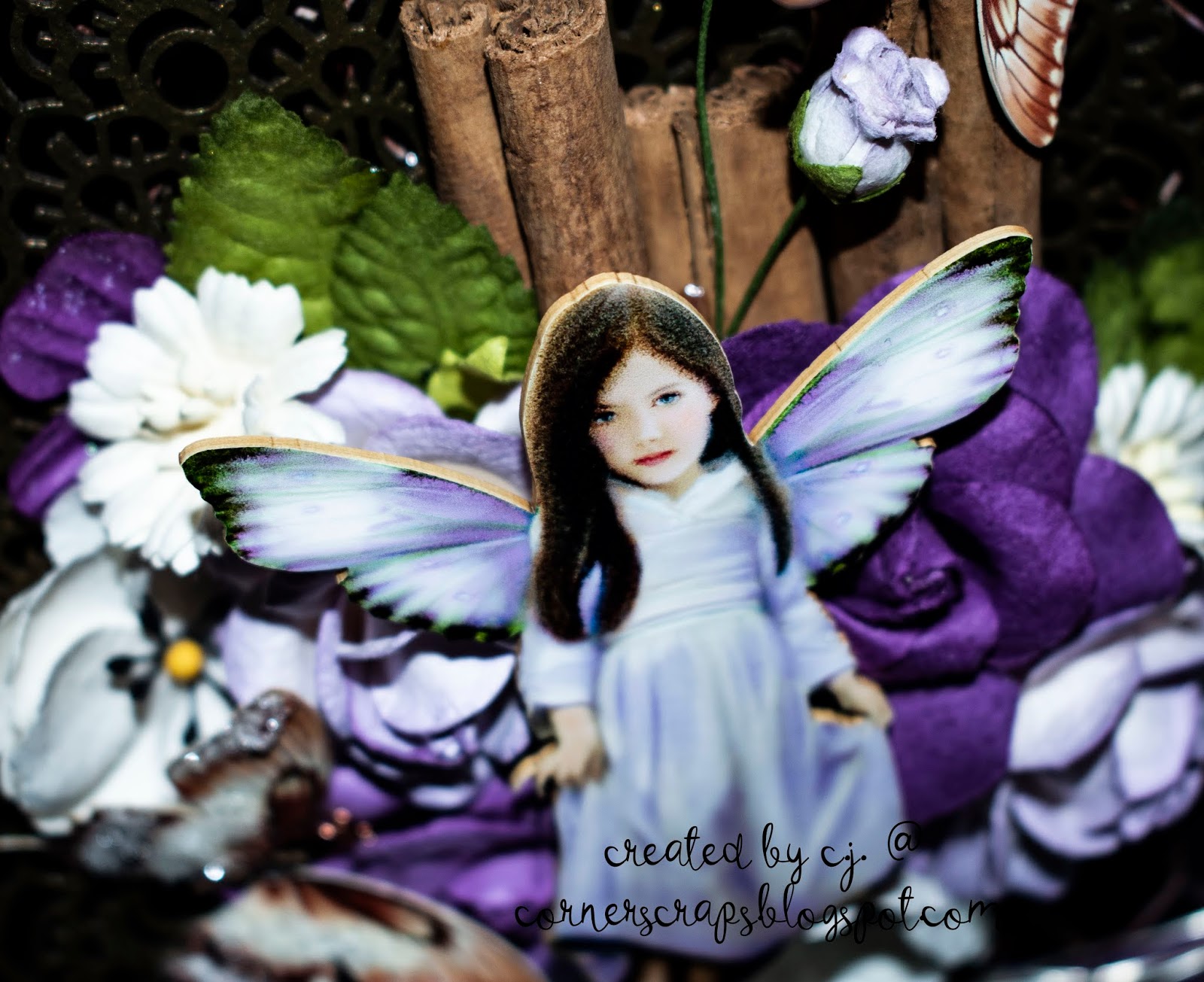 | This darling little fairy, “Tessie B Darling,” can be found over at ReneaBouquets.com, as well as the butterflies and the (light) purple flowers. |