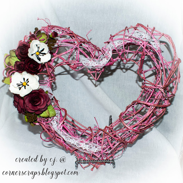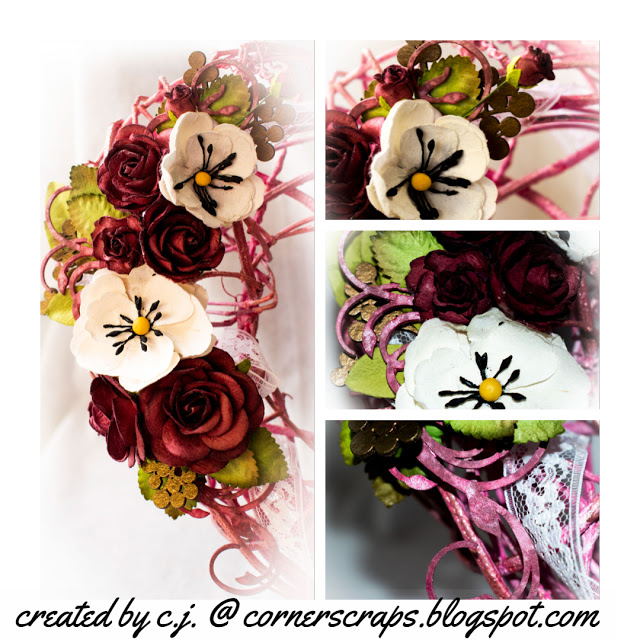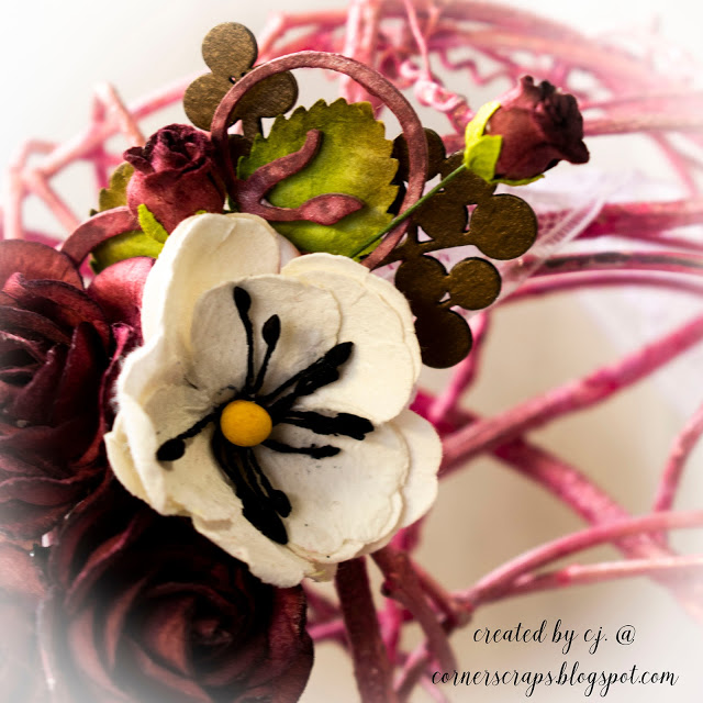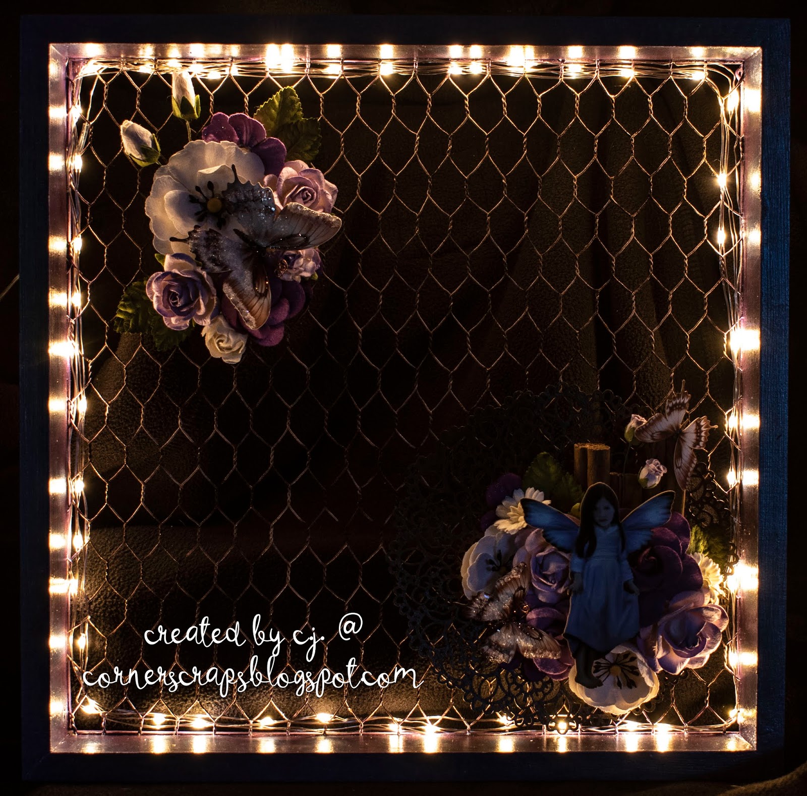 After I primed the shadow box (Kilz spray primer because I didn’t want to use a paintbrush on chicken wire!) I put on a coat of DecoArt “Lavender” Acrylic Paint. After that was dry I applied a thin coat of Prima’s “Frozen Berries.” The chicken wire was sprayed with Ayeeda Mist “Patina Bronze”by 13 @rts. The doily is a Creative Embellishments doily that I used black gesso on then painted with Prima’s “Rustic Brown.”