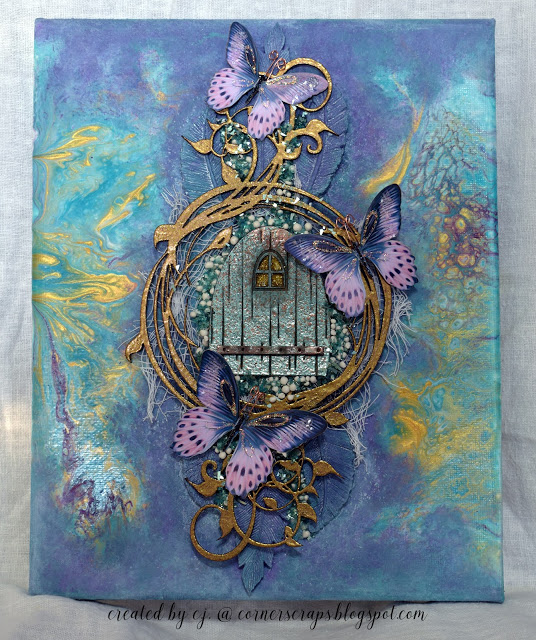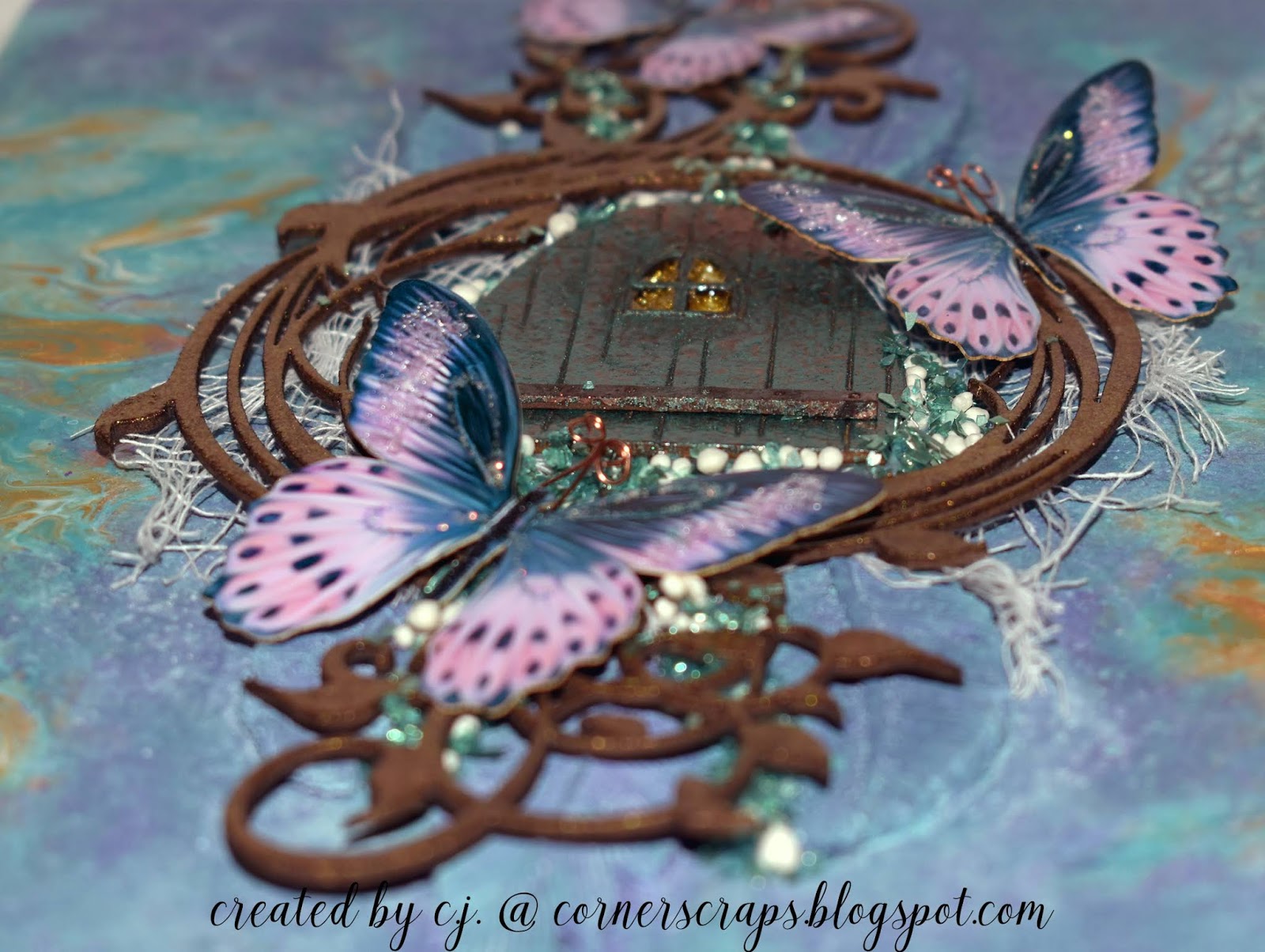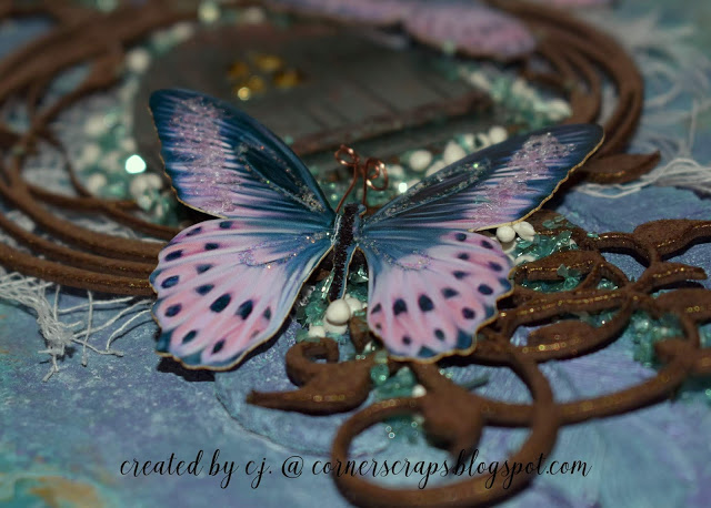 I may not have had a fairy that I could get to “fit” on this canvas, and I have a few different chipboard fairies, I did have a handy-dandy fairy door from Creative Embellishments! I also happened to have the Astral Pink Butterflies from ReneaBouquets, and the color on them is