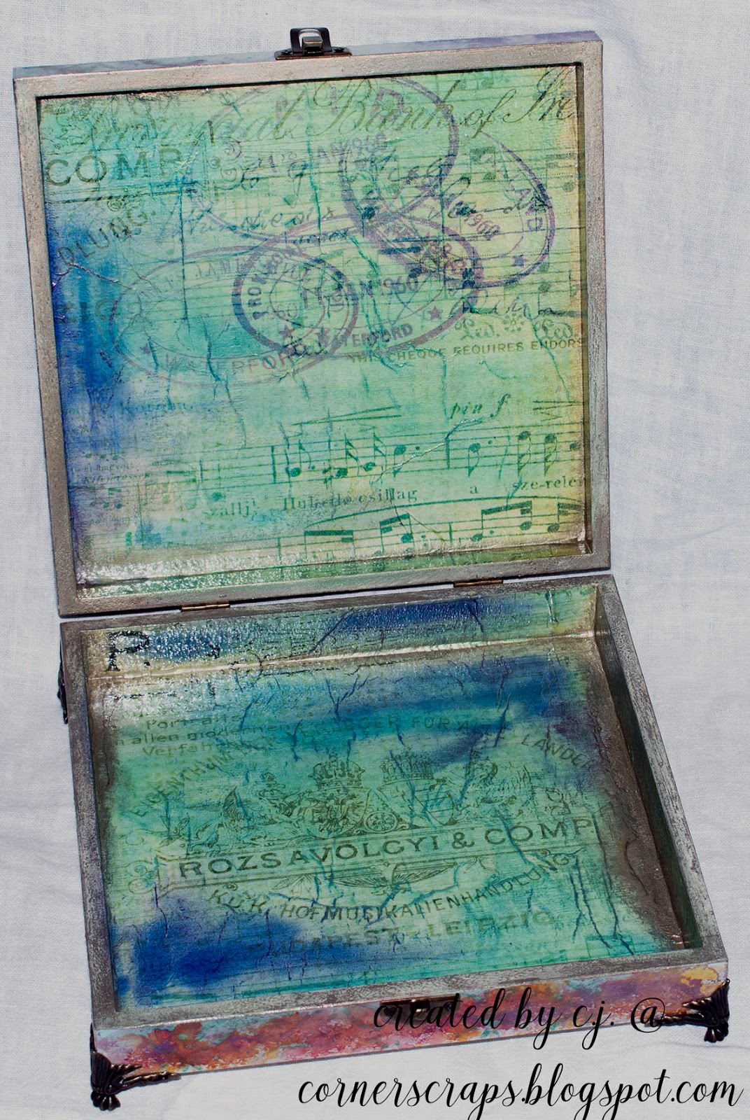 I used Art Glitter Adhesive to hold the papers to the wood. The lid has the 13 @rts paper, and the bottom is only wrapped on the sides with the Hip Kit Club paper (the bottom of the box is just white gesso). I used quite a bit of glue, basically “painting” a thin layer where it would be touching the paper and burnishing it down with the edge of my bone folder and some elbow grease. And I let it dry a full day before moving on to the next layer!