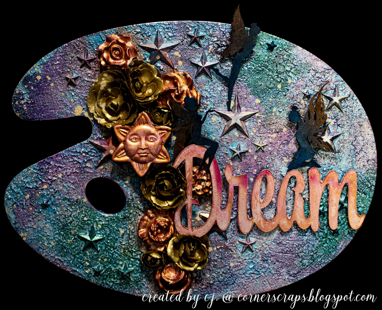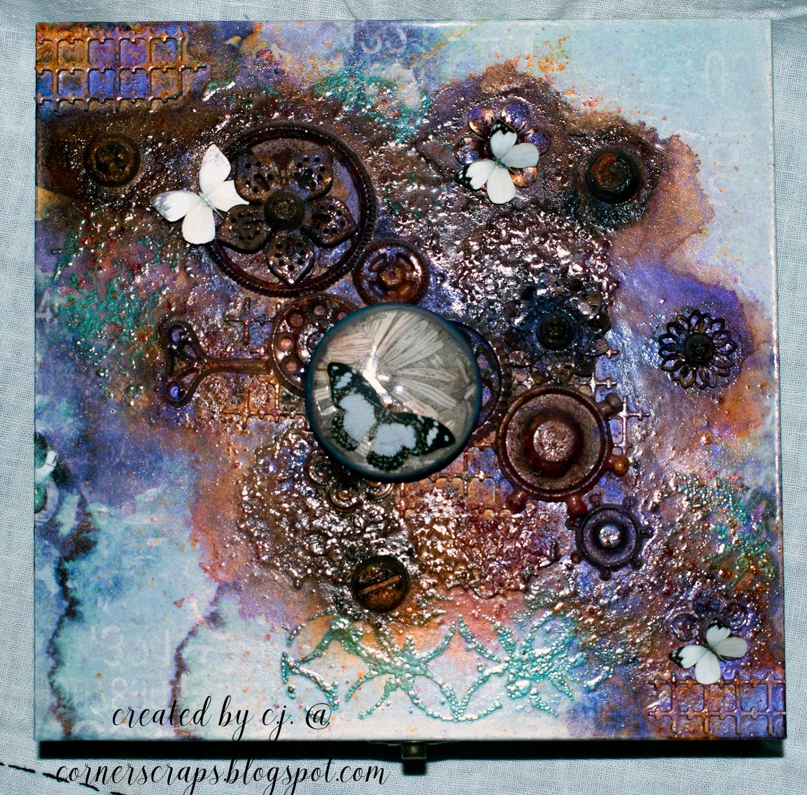 *The cabachon is a 50mm dome on top of a piece from Tim Holtz’s Botanical Layers & a ReneaBouquet butterfly, adhered with JudiKins Diamond Glaze. The edges are done with Finnabair waxes, White Gold & Peacock.*