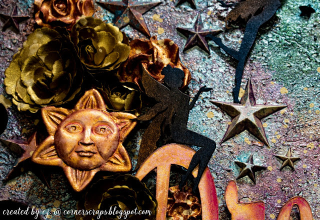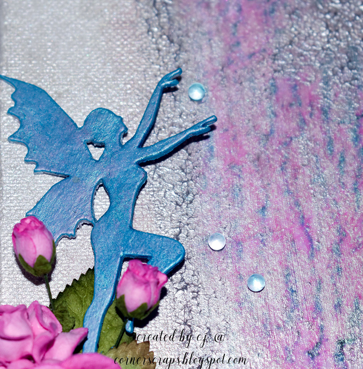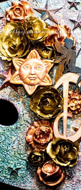 Now, the really wet, “please let the glue and Krylon work their best,” part! First, I had to spritz water where I was planning on adding all those Lindy’s & Jaquard powders, then I had to add more water on top of the powders! I did heat dry, and there is more than one layer of powders (Between the layers I used more Krylon Workable Fixative so there would be no reactivation of the lower levels!). I did the same technique along the sides of the bottom, except there was only one layering of powders. And, because I heat dry the powders, it reheated the embossing powder which caused it to push it’s way through in spots!!