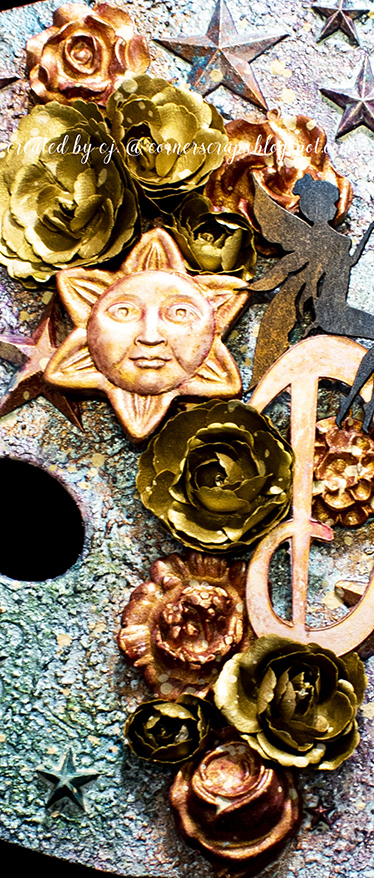 I did not gesso my paper, gesso is wet and I found that to be a risk I didn’t want to take! I used Krylon Workable Fixative as a protective coating before gluing down the Mould pieces, flowers, 7 Gypsies doilies, and ReneaBouquet Grid Beautiful Board. All of these parts, except the Beautiful Board which has it’s own coating, needed gesso before the next step.