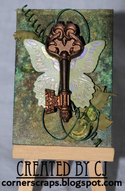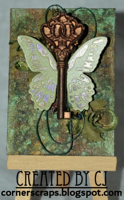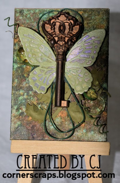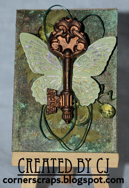 I love the mood board this month over at Mixed Media Place. The wonderful colors of the forest really spoke to me! I’m also participating in the ATC swap over at scrapbook.com, hosted by Marci (you can find her here and here), and was still “needing” to make my “Favorite Product and/or Technique” batch! I have a little of both on these cards! I love, love, LOVE Finnabair’s products by Prima, and I adore using her waxes, but I also love mica powders (in this case I used Lindy’s Magical Shakers), and Tim Holtz was my first designer love (I’ve been collecting Tim Holtz since shortly after I first started scrapbooking!).