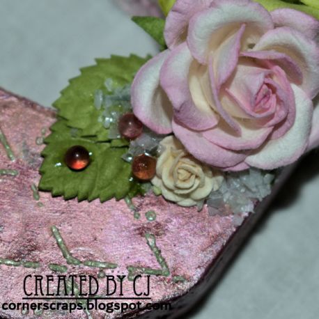 Anyhow, I did happen to have some Lindy’s Magical Shakers in Bratwurst BrownGrab A Guy Gold, and Alpine Ice Rose that I thought would work for this challenge. I “diluted” the Alpine Ice Rose in some white texture paste for the Pale Rose in the color challenge (1st color on the photo below) and used my “new” texture paste for the stenciling on the outside of the shadowbox. I also created the Red Brown (2nd color on the photo below) for the color challenge in a homemade spray by mixing Alpine Ice Rose and Bratwurst Brown, which I sprayed on the (white) Darice flowers.