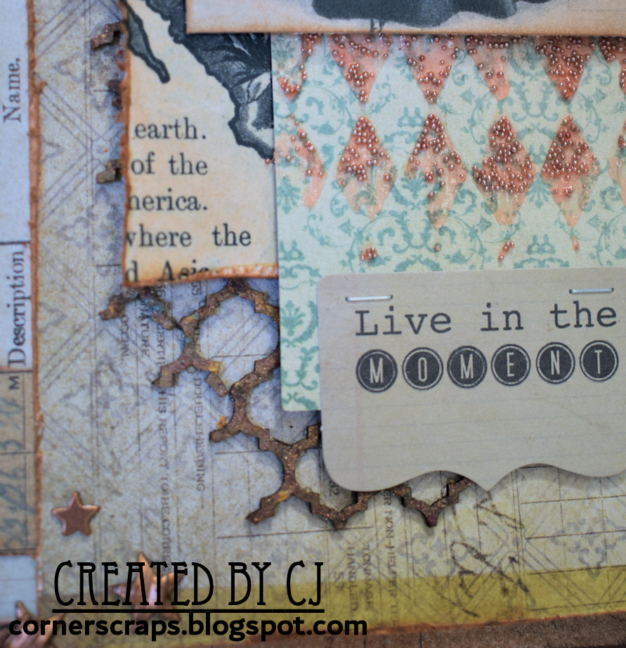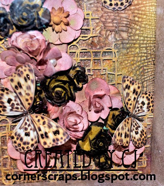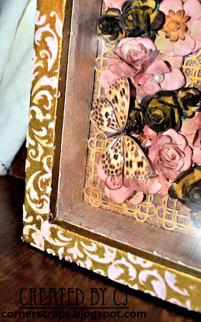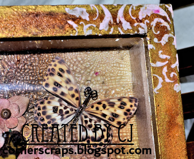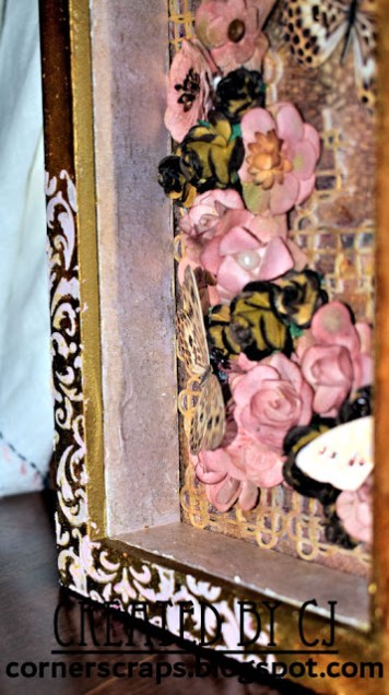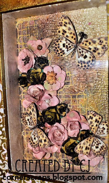 I used a lot of Bratwurst Brown and Grab A Guy Gold on the outside of the shadowbox, as well as on the background inside the shadowbox. On the lattice, after I gave it a coat of white gesso, I used clear embossing ink on the surface and brushed on more Grab A Guy Gold. (There will be a process video link further down this post which will hopefully explain things a lot better than I can with words!)