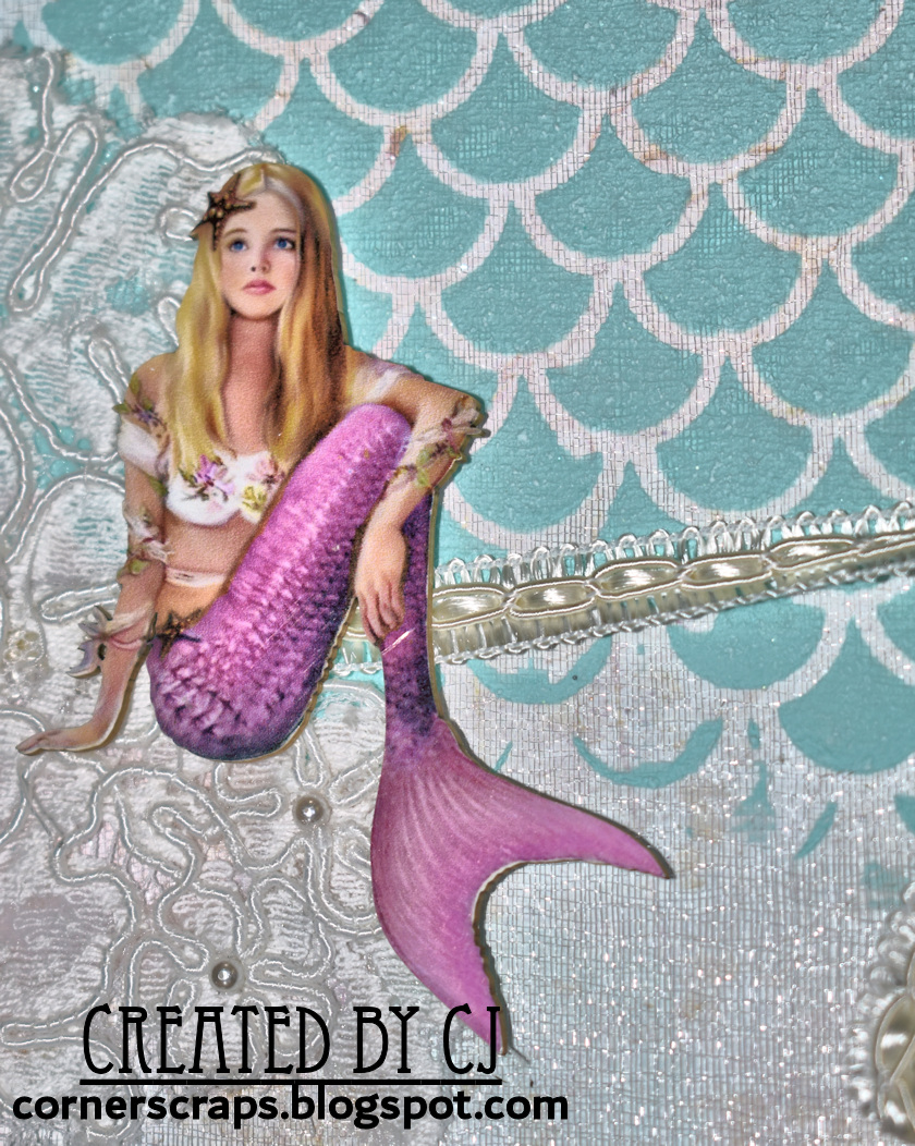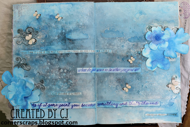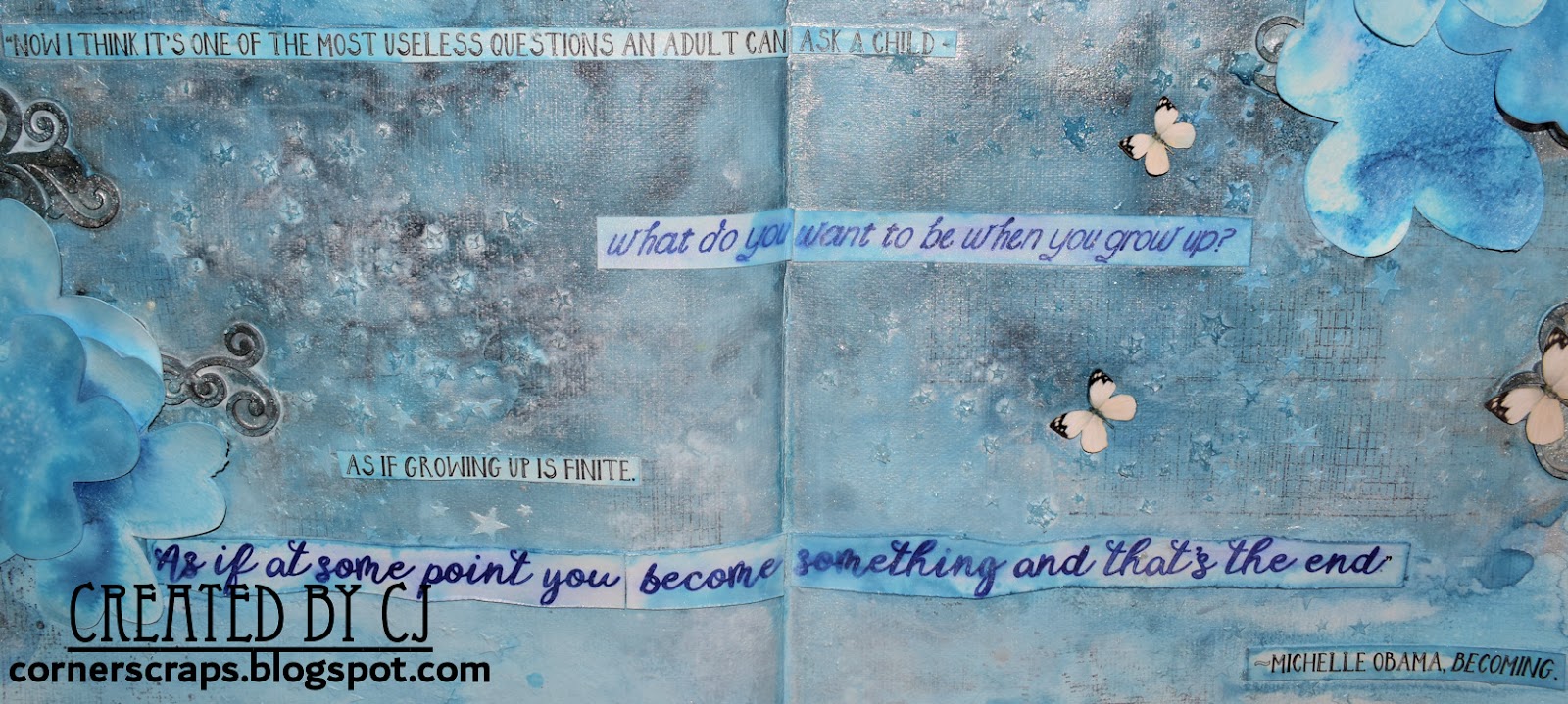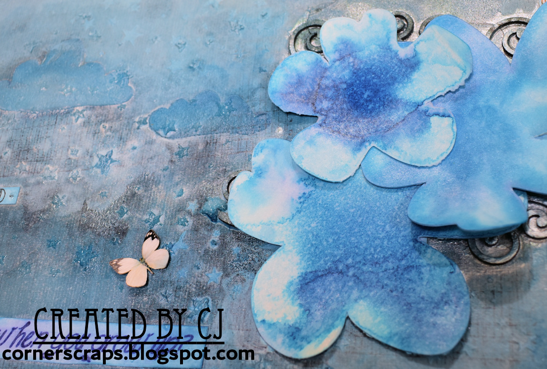 My only inspiration, besides the quote, came from this months Creative Embellishments Color Challenge. It helps that my favorite color is blue! I even managed to get the twist in (clouds or waves) when I stenciled on some clouds!
