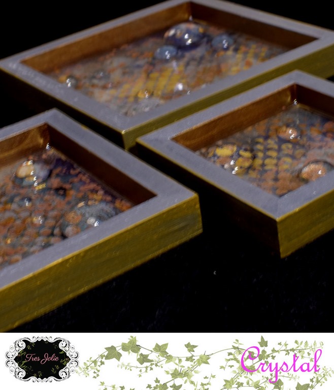 I sprinkled my “Henna” and “Gold Leaf” mica flakes on the bottom, then sprinkled the “Frosted” on top of the epoxy. After that was done I popped the Prima Mélange Art Pebbles in and set the trays on a nice level shelf to cure for 24 hours!