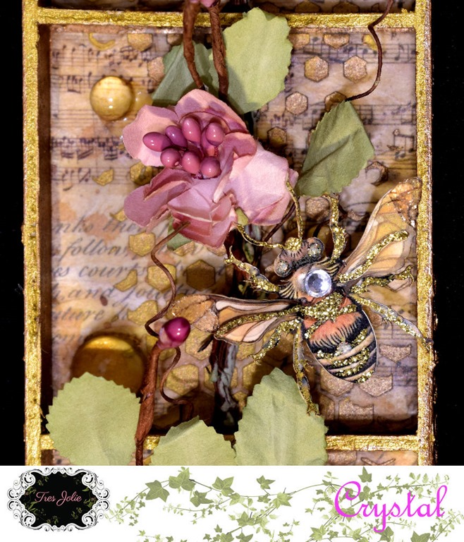 Even though in the beginning I wasn’t completely sure if I’d use the ReneaBouquet Bees from my stash, they were the inspiration for the colors! I really just wanted everything but the flowers to have neutral coloring, so I used the “Ancient Coin” and “Steampunk Copper” Prima Paints from the kit on the box and rice paper (also from my stash) with the stencil.