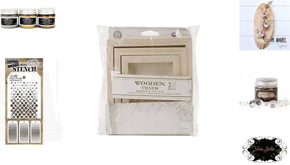 My first project for this month for the Tres Jolie Kit Club focuses on using the fabulous Prima Wooden Trays, one of the three stencils, all three paints, and some of the Prima Mélange Art Pebbles found in this months Mixed Media Kit, along with a few items from my stash!