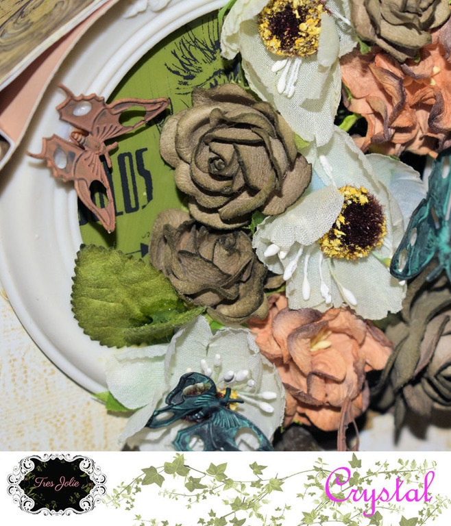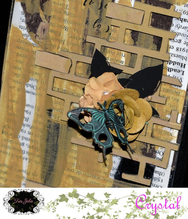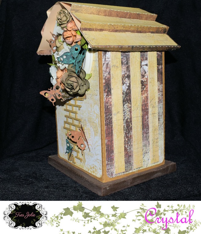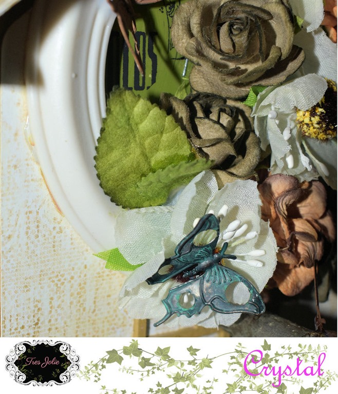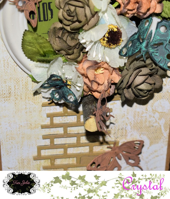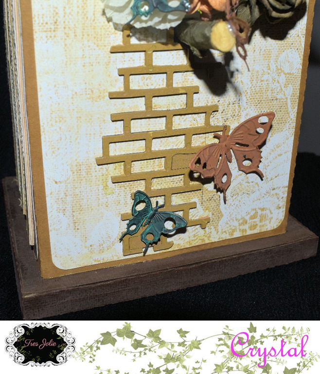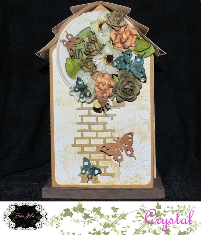 I used the larger circle from this month’s kit on the “entrance” of the birdhouse, then used the last of the transparency and flowers from my stash to fill it in! The stick is one from my yard, the brick chipboard is from the kit, and painted with a single layer of the Cafe Au Lait paint. I added some of the metal butterflies to finish things off!