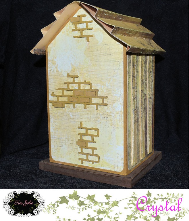 I created the birdhouse with various brown and tan cardstock sheets and some patterned papers from Friends and Craft O’Clock using Silhouette Store ID# 271046 – “Birdhouse 3D Gable Box” by Snapdragon Snippets (Snapdragon Snippets Assembly Instructions)