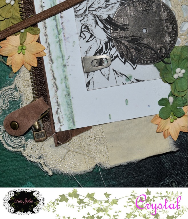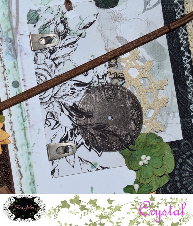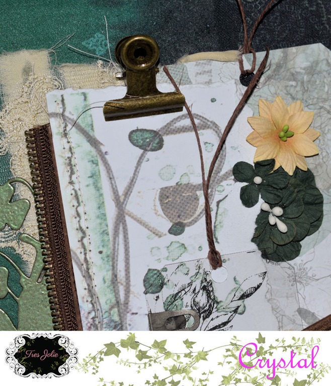 On the spine I let some of the fibers from The Paper Studio peek through the zipper, then added a Prima Vintage Trinket! I added some “Sage” Embossing Powder by Ranger to the chipboard from the kit and added it to the layers on my cover.