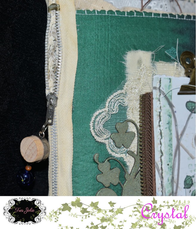 I layered some scraps of fabric, lace, and a zipper from an old jacket with items from this months kit on the cover, “holding” them in place with clips from my stash!
