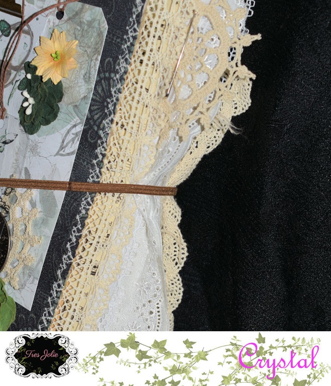 Heat n Bond Lite Iron-On Adhesive; Pellon 70 Peltex (Midweight – Heavyweight Fabric Stabilizer); Sari Silk; Scrap fabrics; Various Scrap Laces (*Some from previous Tres Jolie Kits); The Paper Studio Ivory Crochet Lace; 2” Book Binding Tape; 1” BEST Double Sided Tape; We R Memory Keepers 3 Way Corner Punch; LineCo PVA; FabriTac; Spellbinders Tool n One; LineCo Linen Hinging Tape 1.25”; Ranger “Sage” Embossing Powder; Simon Says Stamp Clear Embossing Ink; *Small Doilies; Tim Holtz Index Clips; Binder Clip; We R Memory Keepers Crop A Dile Corner Chomper; E6000; The Paper Studio Fibers; *Prima Vintage Trinkets
