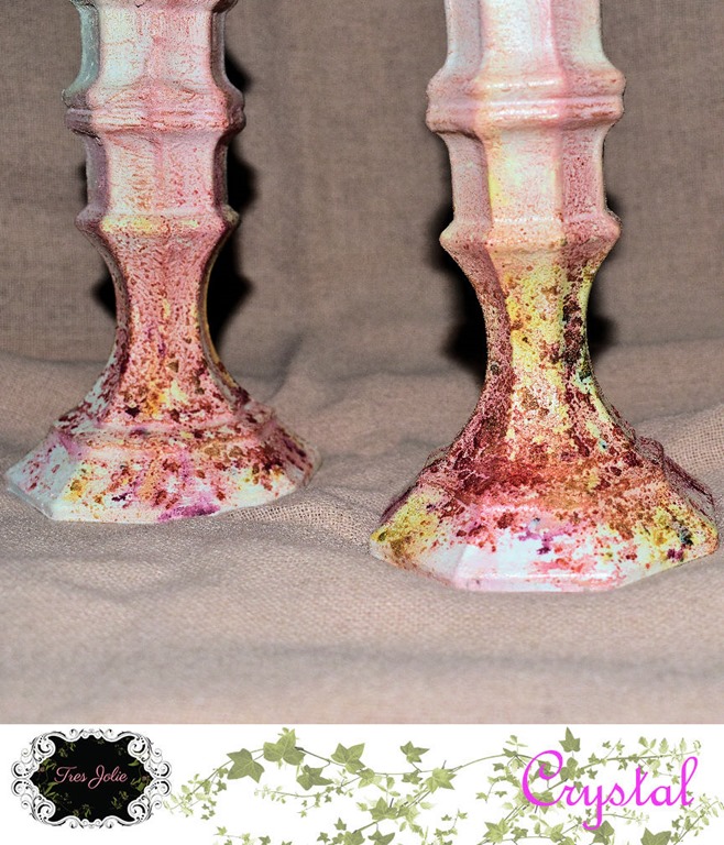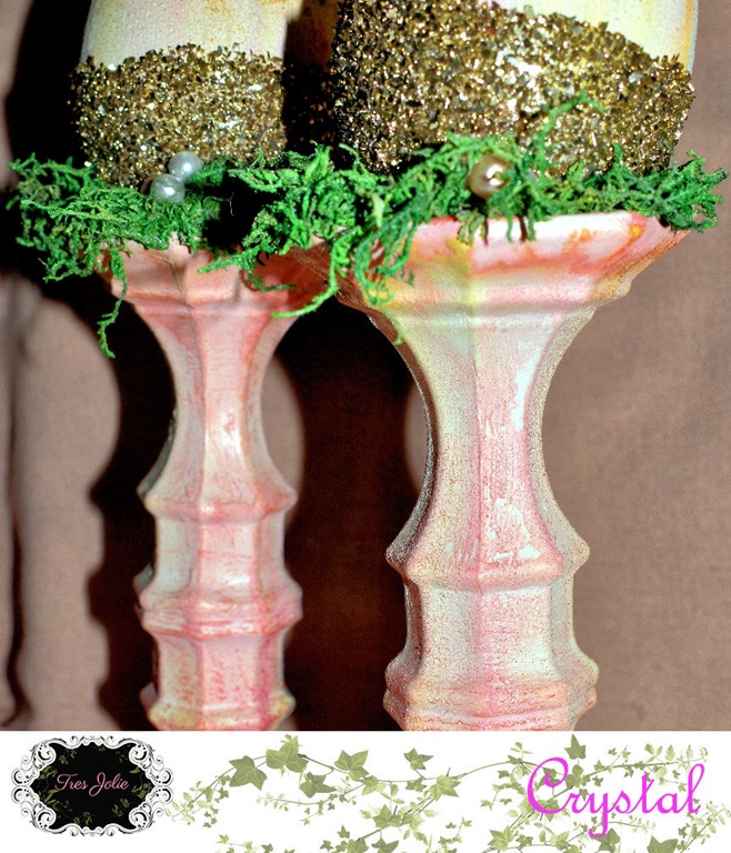 Kilz Original Primer, Glass Candlesticks from Dollar Tree, Floral Garden “Floral Moss,” Krylon Workable Fixatif, Mod Podge Matte Acrylic Sealer, JudiKins Diamond Glaze, *13@rts Gel Medium, *13@rts “White” SPLASH! Ayeeda Ink