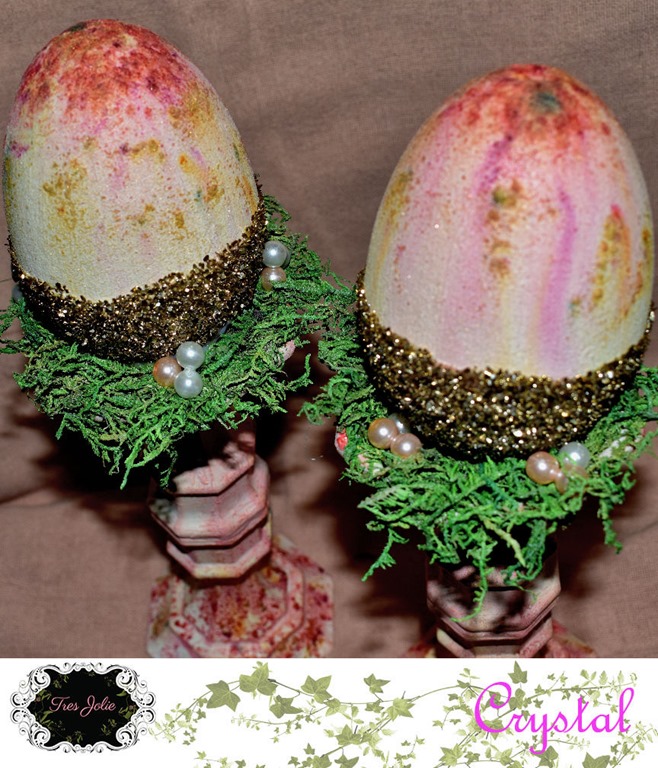 I added some glitter from this months kit to the bottom of the eggs, set them in some moss, and added some pearls to accent!