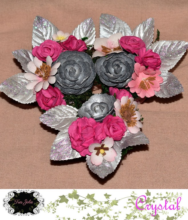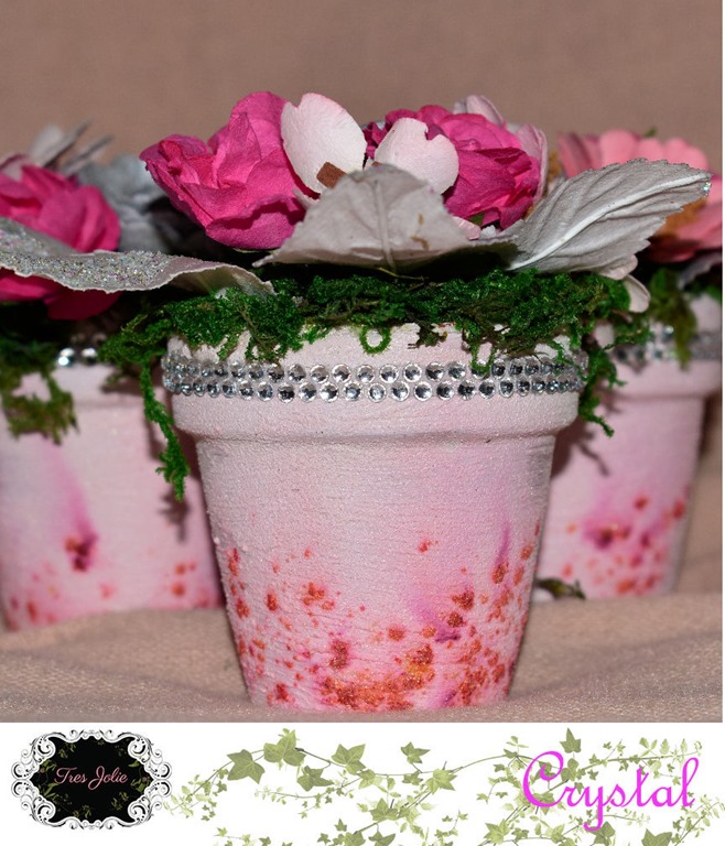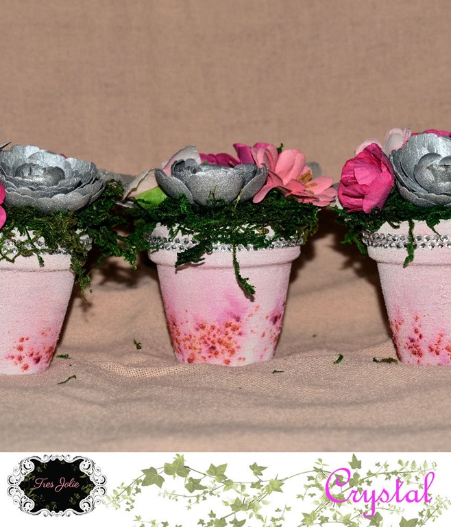 ModPodge Gloss Acrylic Sealer; FabriTac, Clay Pots; Floral Garden “Floral Moss”; *13@rts Gel Medium; *KaiserCraft Paper Blooms “Hot Pink”; *Prima Flowers Sunrise Sunset Collection Item# 565190; *Prima Flowers Item# 632564; *Prima Flowers North Pole Item# 590680