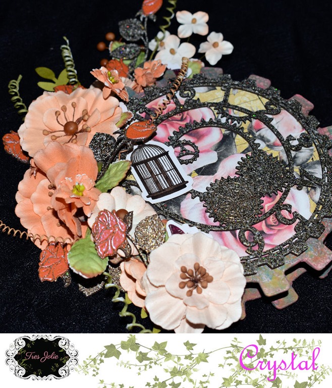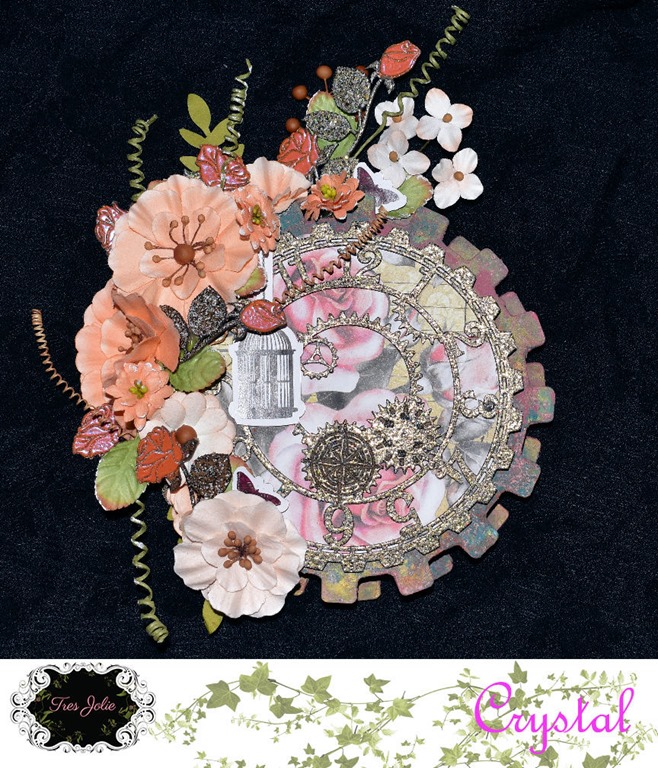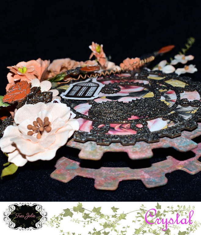 I used some Prima Texture Fantasy Paste on my chipboard gears, and the embossing powder from the kit on my clock face, which I also back with some of the patterned paper from the kit.