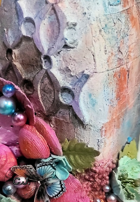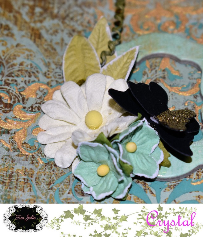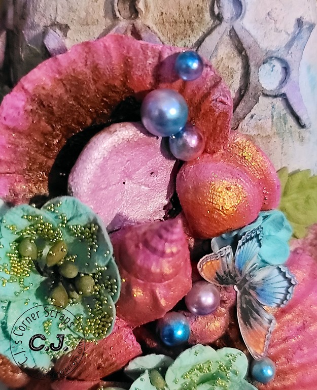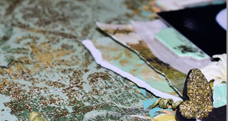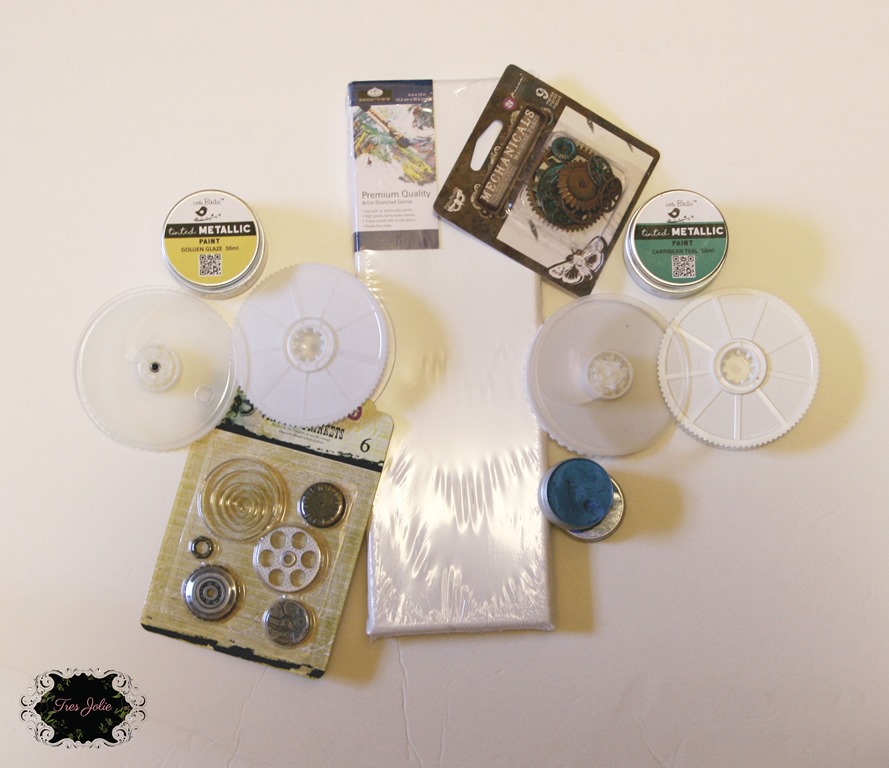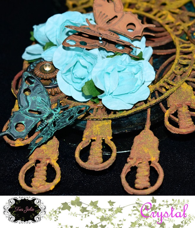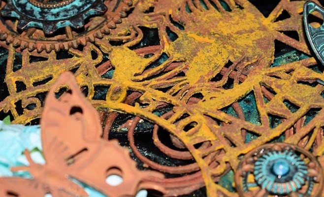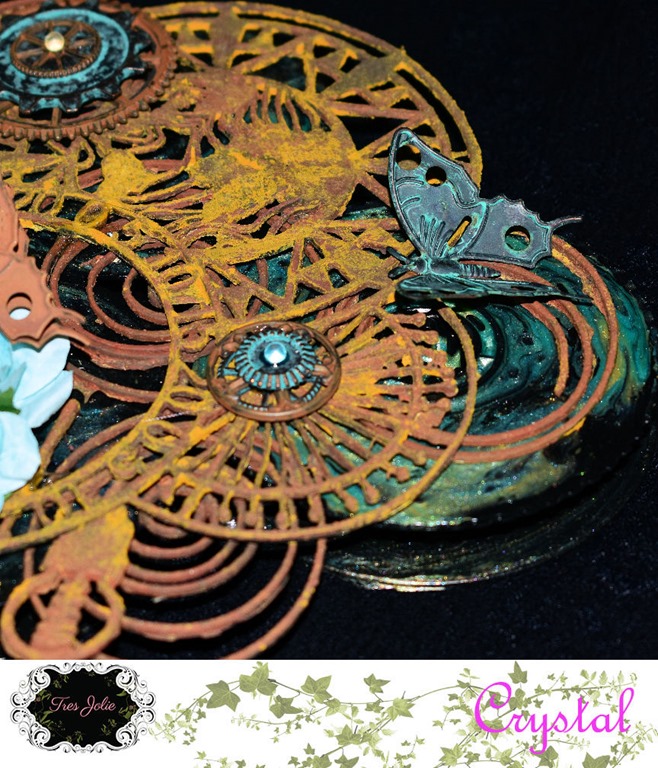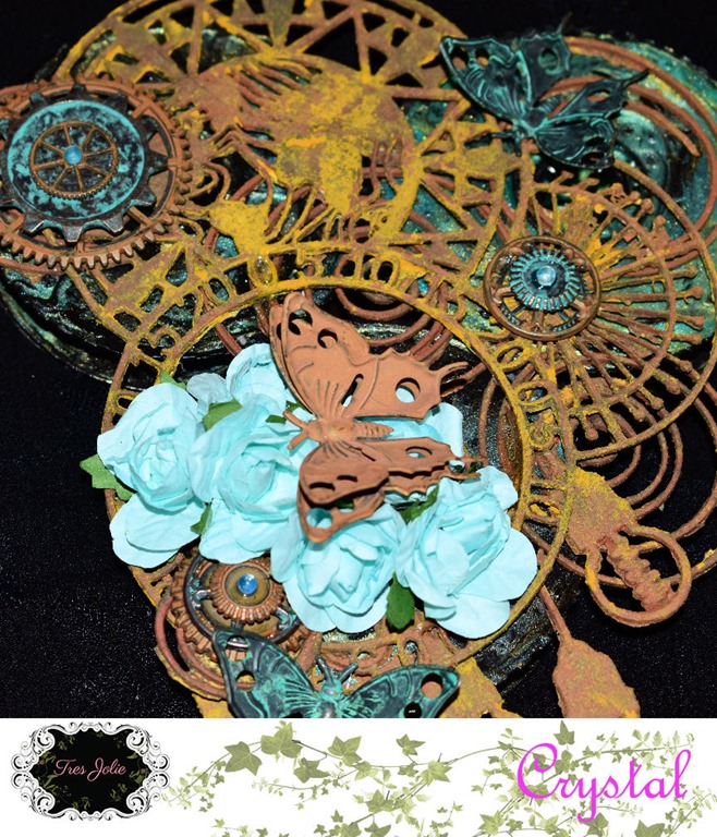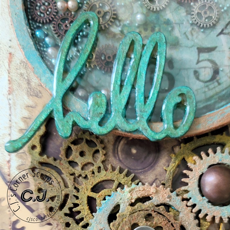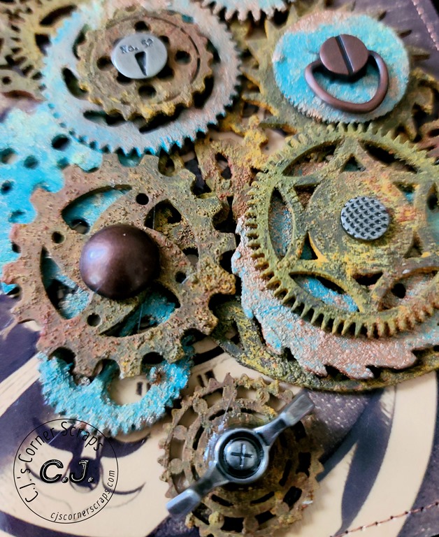 Creative Embellishments – “Circle Shaker Set,” various “Gear Sets” for all of the chipboard gears, and “Steampunk Artist Trading Coins,” Stamperia Rice Paper (DFSA4242), ReneaBouquets – “Bronzed Teal” Beautiful Beads, Prima/Finnabair Rust Effect & Patina Effect Paste Sets, Prima/Ingvild Bolme Tiny Junkyard Findings “Nailheads” & “Special Screws,” DCWV “Tattered Time” Cardstock, Little Birdie “Caribbean Teal” Tinted Metallic Paint, Emerald Creek/Seth Apter Baked Texture “Vintage Beeswax,” Simon Says Stamp Clear Embossing Ink, Heidi Swapp Wood Veneer, Tim Holtz Distress Collage Mediums “Matte” & “Crazing,” Copper Thread, Unknown “Blue Metallic” Microbeads, Unbranded Metal Gears, Liquitex Black Gesso, BEST 1” Double Sided Tape, FabriTac, Art Glitter Glue, E6000, EK Tools Score Board, Tim Holtz Mini Snips, Spellbinders Tool n One, Ranger Heat-It