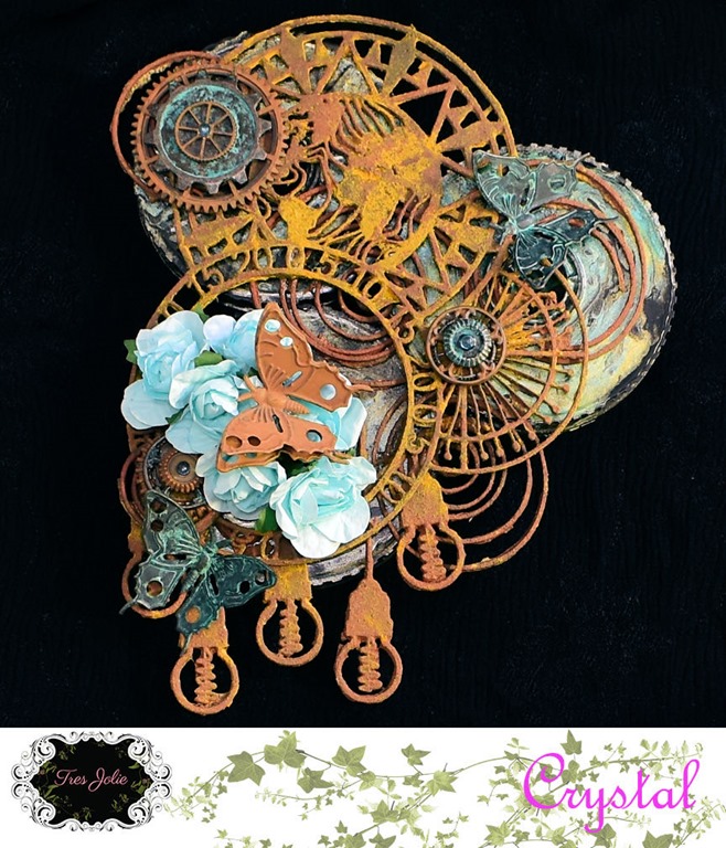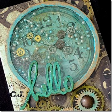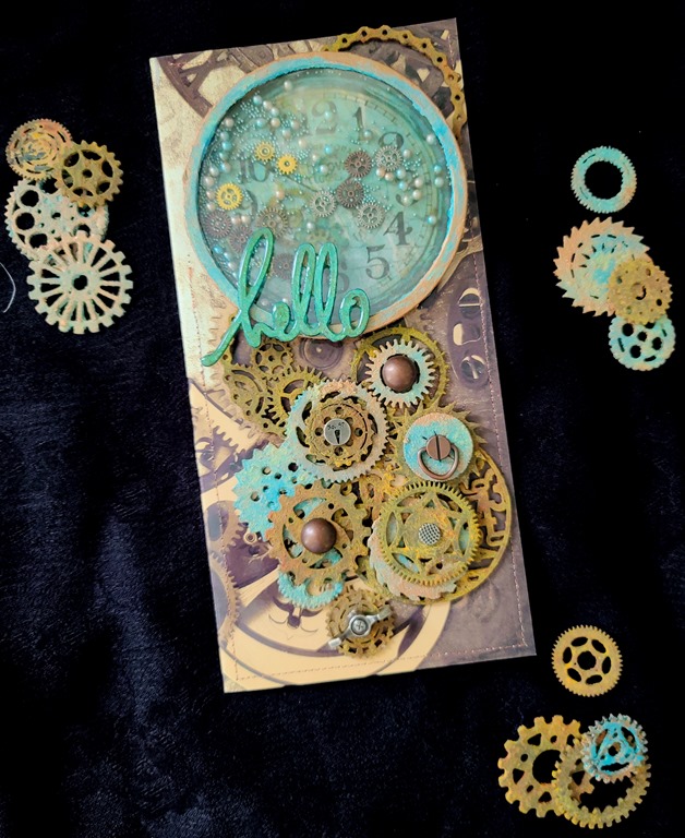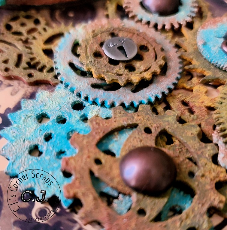 I don’t know what I’ll be doing with the card yet, but it’s good to have some one hand! Or so I’ve heard, I’m not a real big card maker, I find them difficult to do! But I’m happy with how this one has come out! All of the chipboard gears, the ATCoins, and the Circle Shaker Set are from Creative Embellishments, I just added the Patina and Rust Effect Pastes to go with my old, DCWV paper.