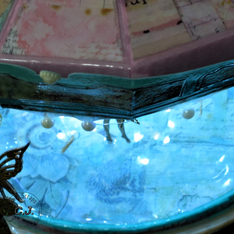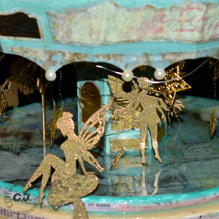 After I followed the assembly instructions on SVGCuts, I coated everything in epoxy (in stages!), attached my fairies, added the filigree, ran the lights, and added the flatbacks! Most of the time spent on this project was waiting for the epoxy to dry and the carousel assembly.