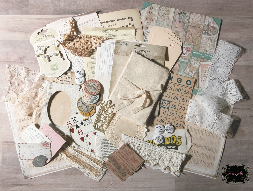 Today I’m bringing you the junk journal I created using this month’s Cards, Tags, & More Kit from the Tres Jolie Kit Club. I had such a blast making this journal, and even though I didn’t originally intend to kill the kit, as I kept going it became a personal challenge to see if I could get everything in!
