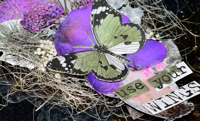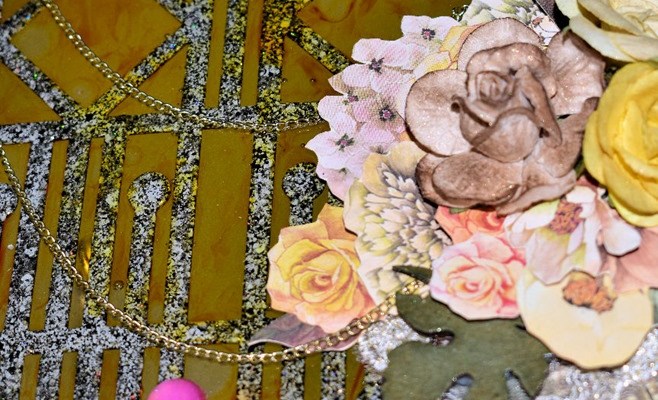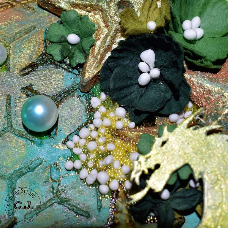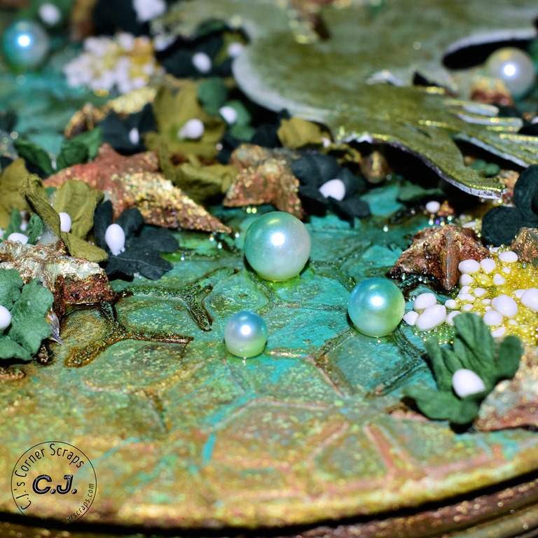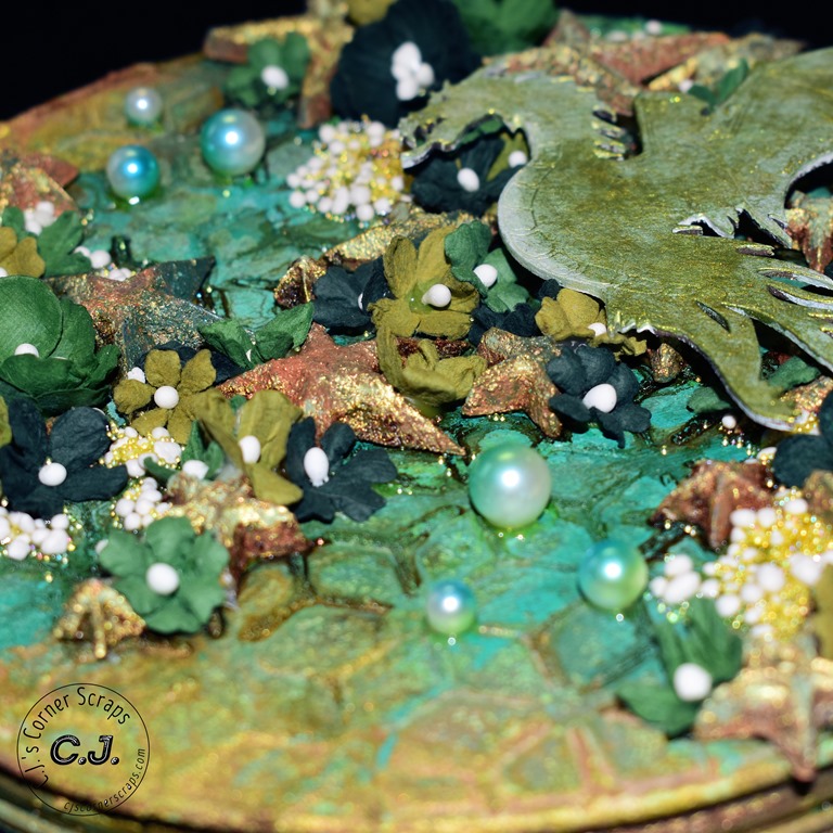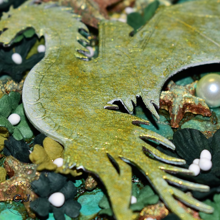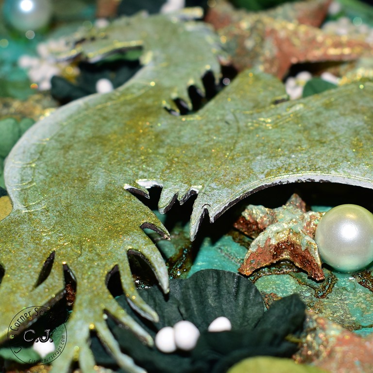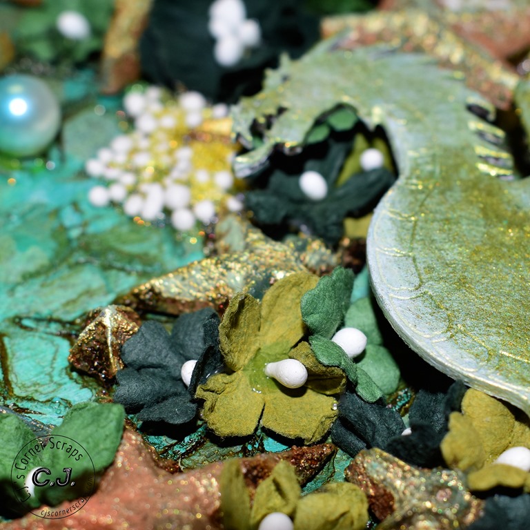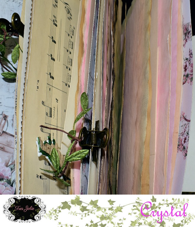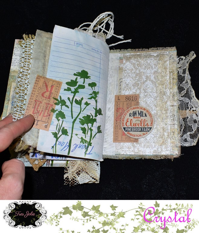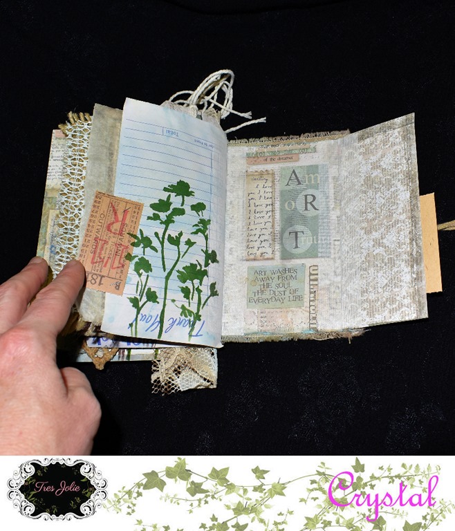 I used the new Tim Holtz color, “Speckled Egg,” throughout the journal. It went beautifully with the Stamperia papers that came in this months kit. For the resin pieces I used some of the “Speckled Egg” oxide and embossing glaze, and some “Gathered Twig” Distress Crayon.