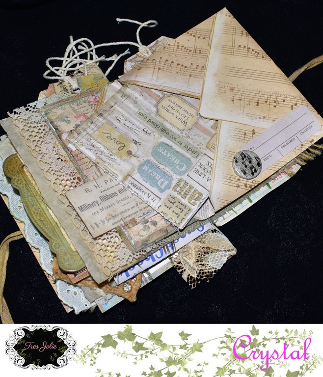 I cut out the ATC sized cards from the paper and attached them to one side of the popcorn bag that came in my kit! (Your bag may be different) I turned the two music prints into envelopes and added them in, and peeking out of this one is a little notebook I made from the largest left-over piece I had and some standard notebook paper.