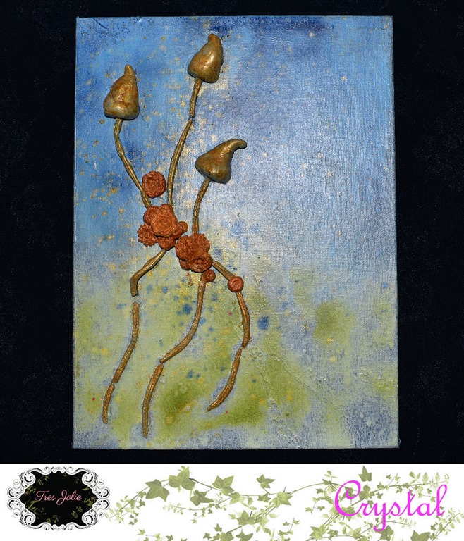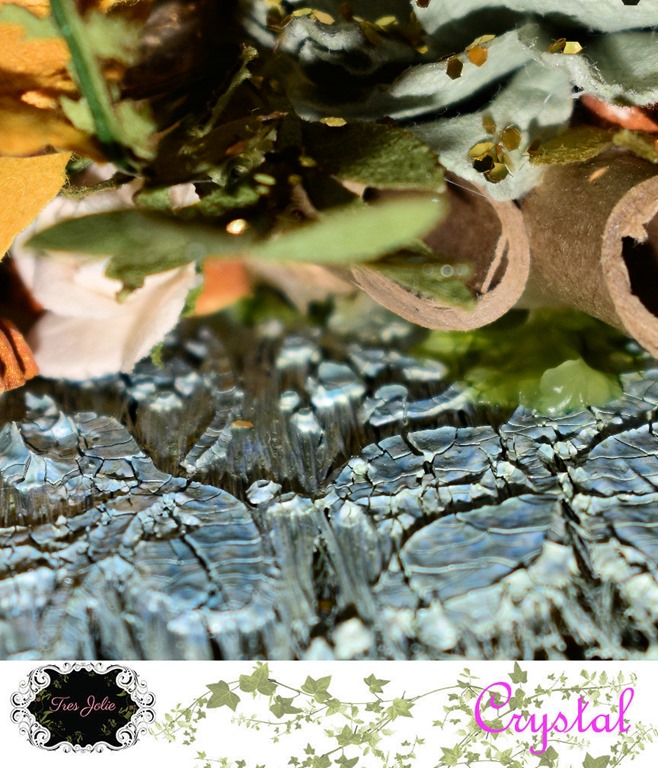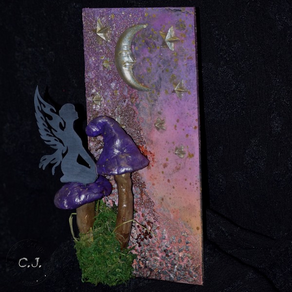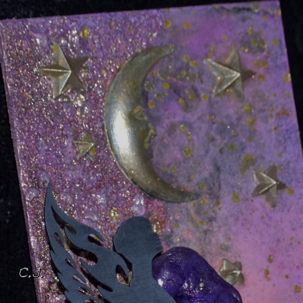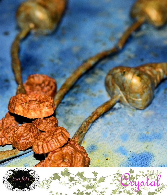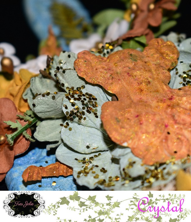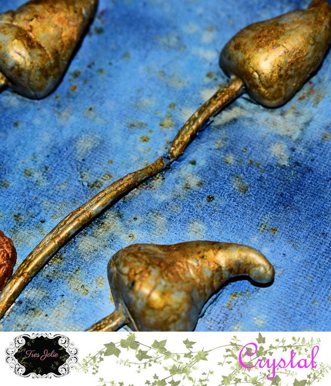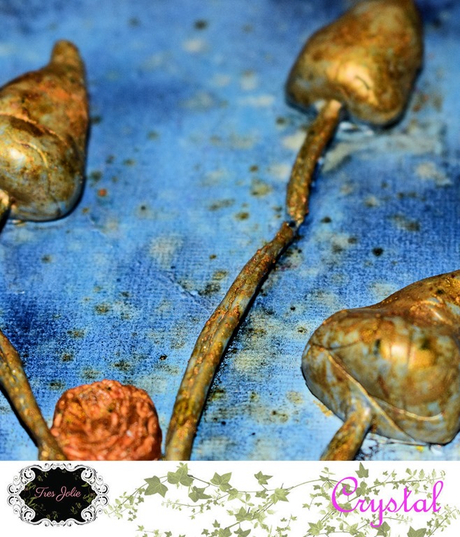 I layered some gilding flakes on top of some homemade texture paste using Ranger’s Sticky Embossing Powder, added the “Mermaid Artist Trading Coins” to the base, glued down some shells, used some of Finnabair’s wonderful waxes, and added some 13 @rts microspheres as a finishing touch.