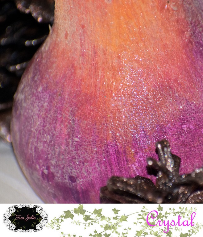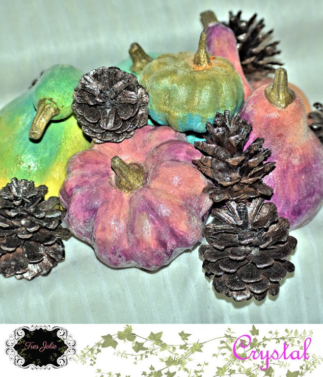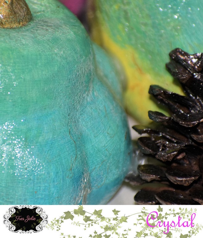 After my Dina Wakley paints dried, I coated all of the stems in some “Vintage Gold” Metallique Wax, then coated all of my gourds and pumpkins in some “Clear Rock Candy” Distress Crackle paint. I really love the frosted look it lends to the pieces.