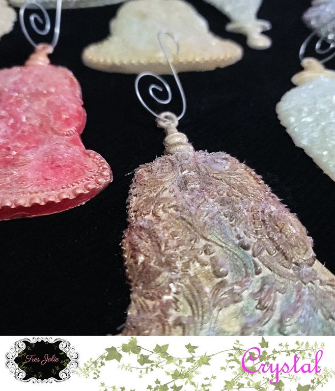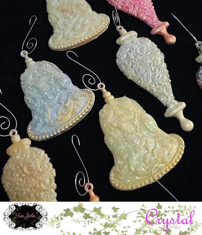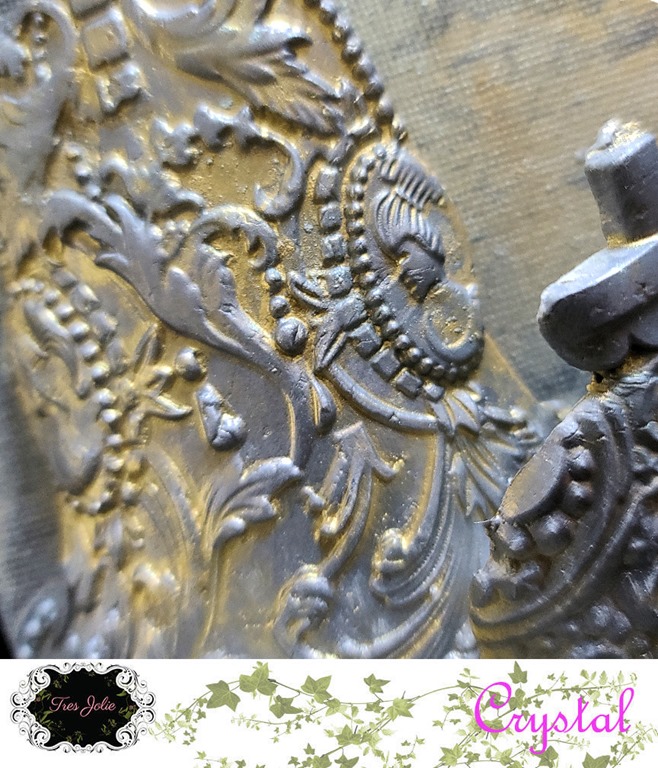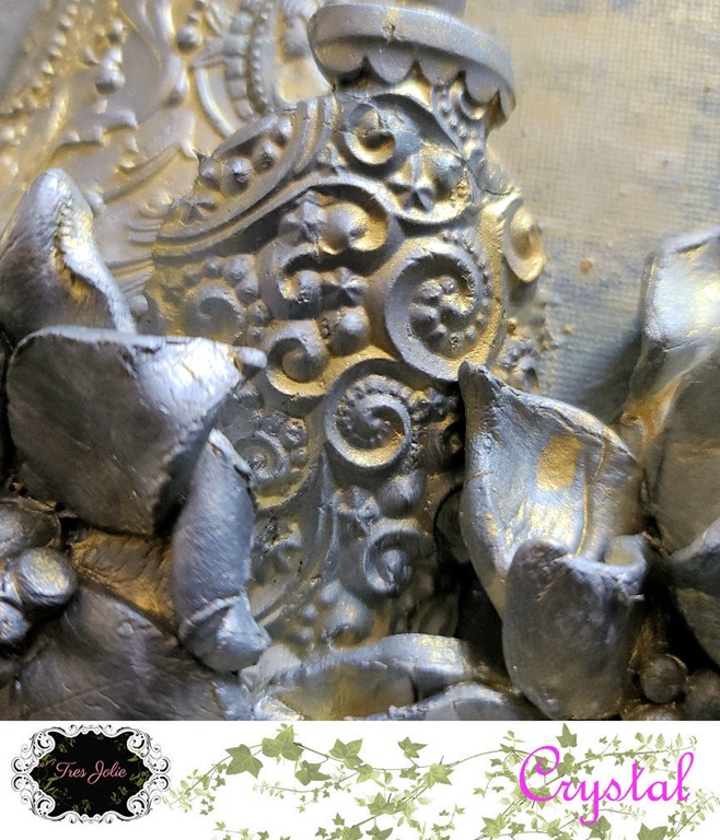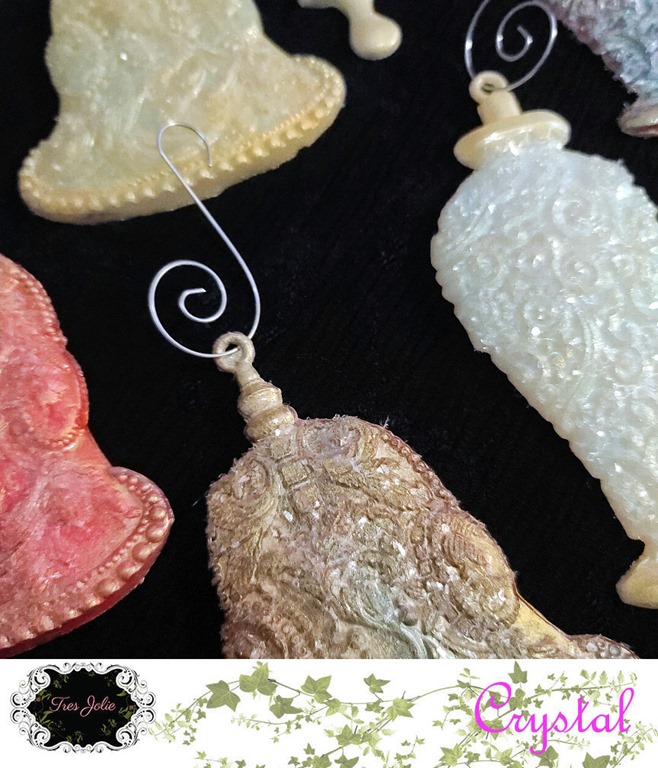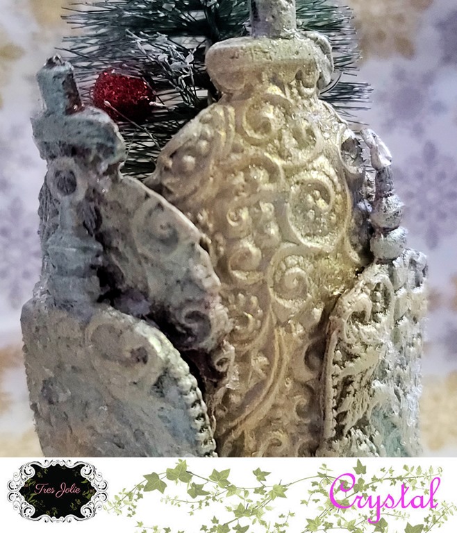 ReneaBouquets “Frozen” Premium Paper Glitter Glass Butterflies, Ranger/Tim Holtz “Clear Rock Candy” Distress Glitter, Tonic Nuvo Gilding Flake “Radiant Gold,” Prima/Finnabair Heavy White Gesso, Liquitex Matte Super Heavy Gel, Ranger Glossy Accents, JudiKins Diamond Glaze, TCW Light & Fluffy Modeling Paste, Ranger Heat It Tool