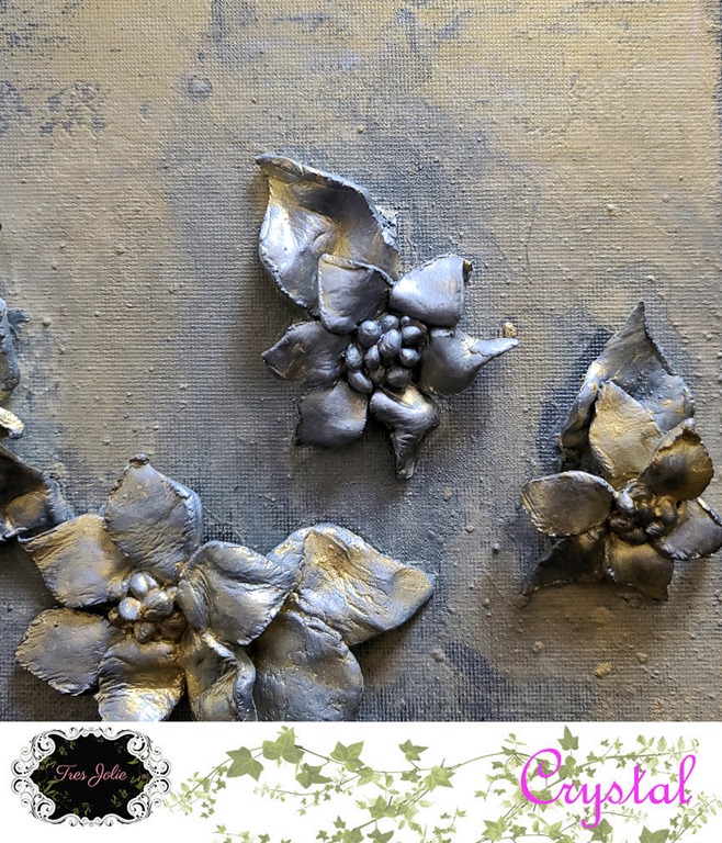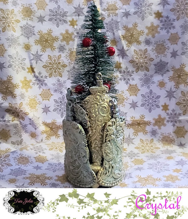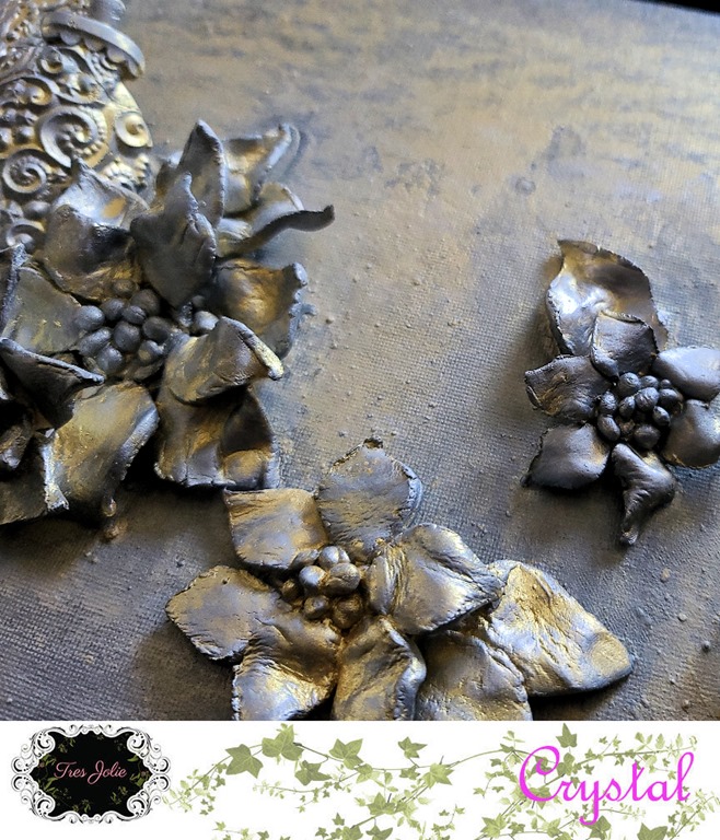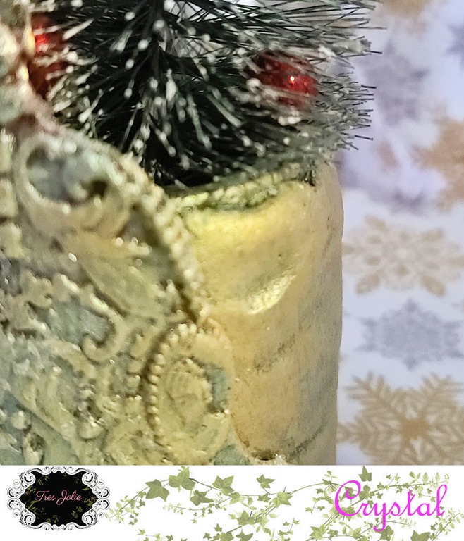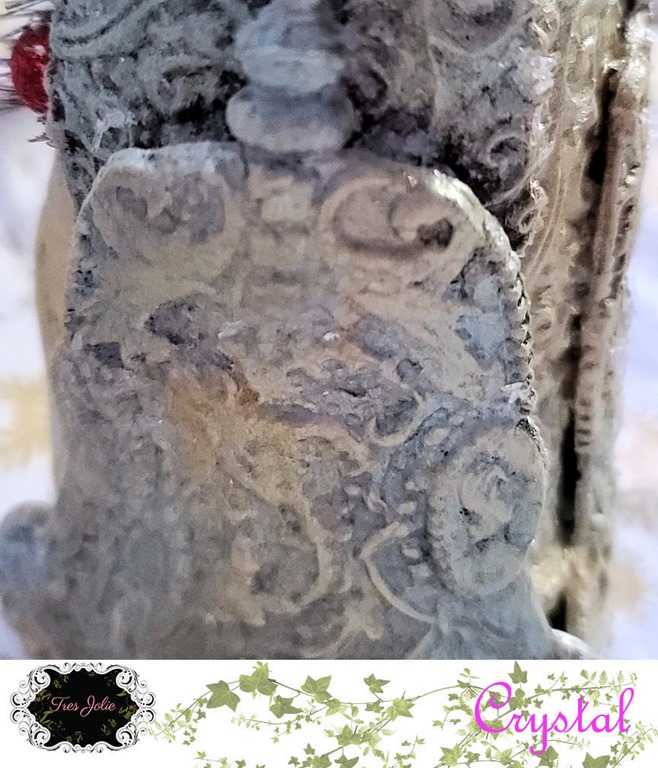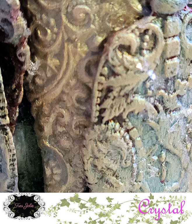For my background snowflakes, I used some regular texture paste from my stash with the Snowflake stencil from this month’s kit then topped the, still wet, texture paste with some Distress Glitter (also from my stash) to add some shine to the background. On the flourishes, I used some gilding flakes from my stash to give them the metallic shine I was looking for, but to also make them “rough”,” compared to an embossed finish anyhow.