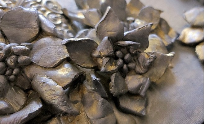 I used a 12” plywood circle from Creative Embellishments as my base, coated the edge with the Embellishment Mousse from the kit, added my paper, stenciling, and decorations…all in a few hours! Check out how I did it in my video below: