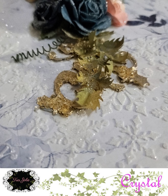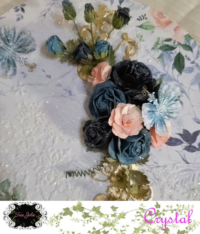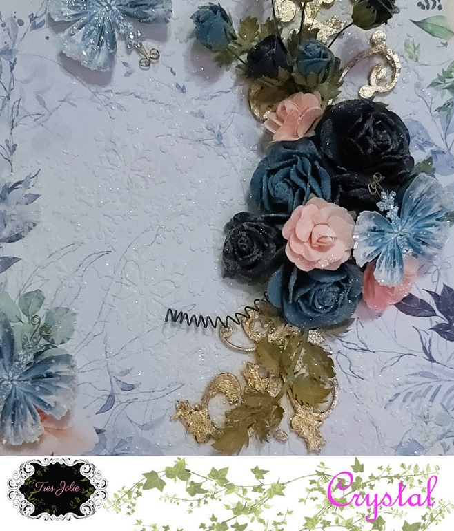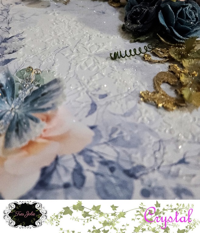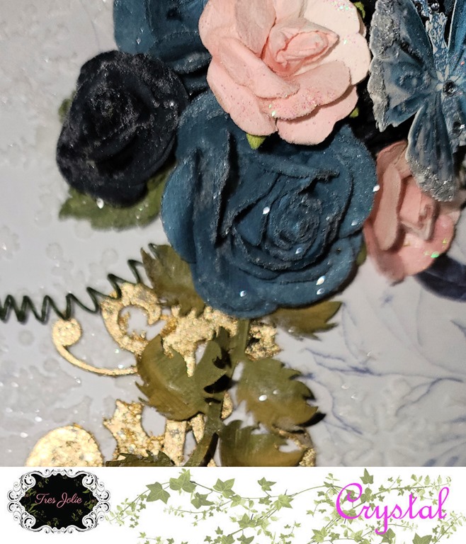 To keep with my “Frozen In Time” theme, I added some of the same Distress Glitter I used on the background to the blue, Graphic 45, roses. I didn’t need to add any to the peach-y roses, because they already have a bit of glitter on them.