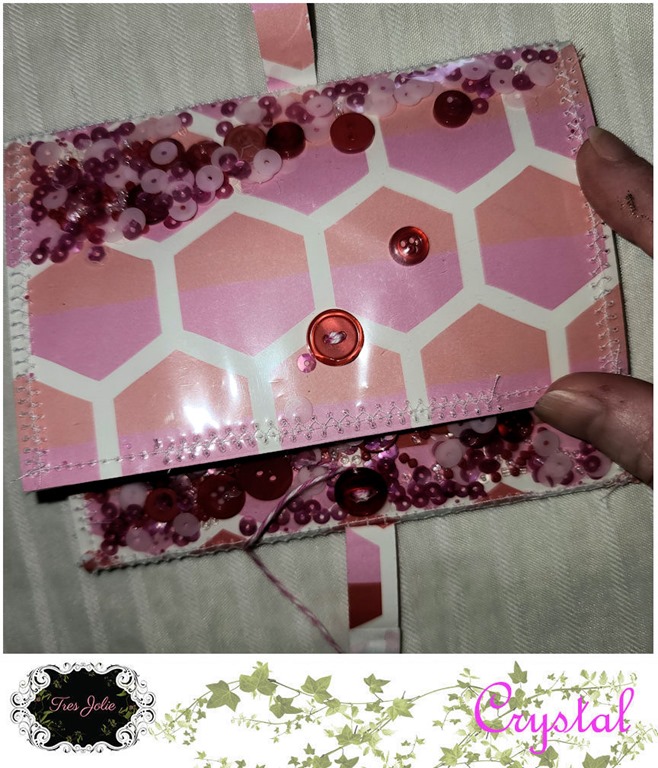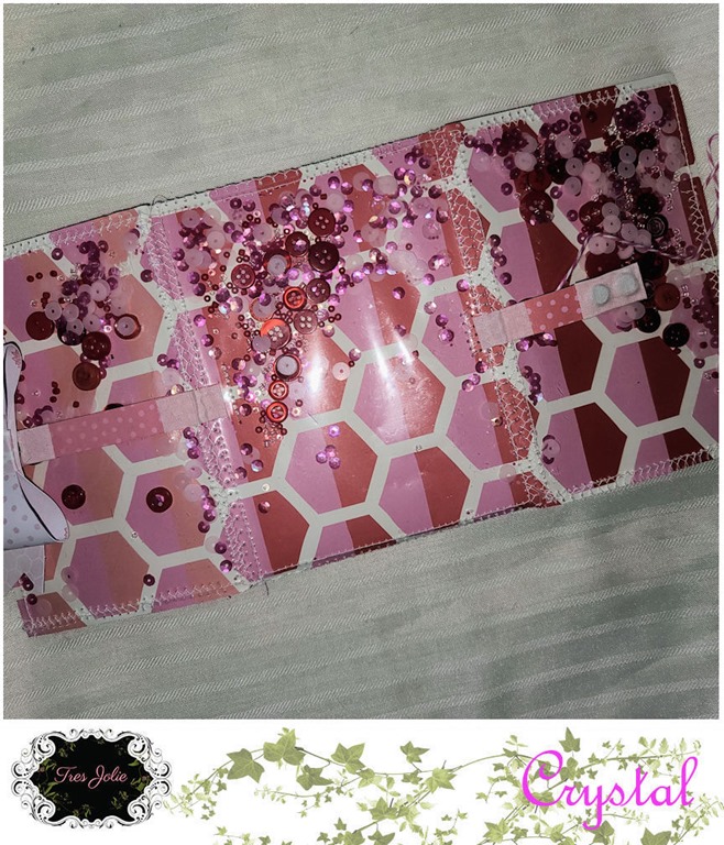 For the album (and the inside envelope) I used some Paige Taylor Evans papers from my stash, but used papers from the kit as my ‘accent’ pieces and to make the bow. To make this into a shaker, I grabbed up a 12×12 page protector, inserted the album cut, and started stitching to make the pockets. After all the stitching was completed I trimmed off the excess page protector.