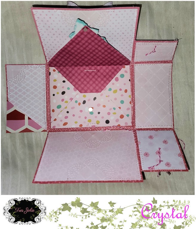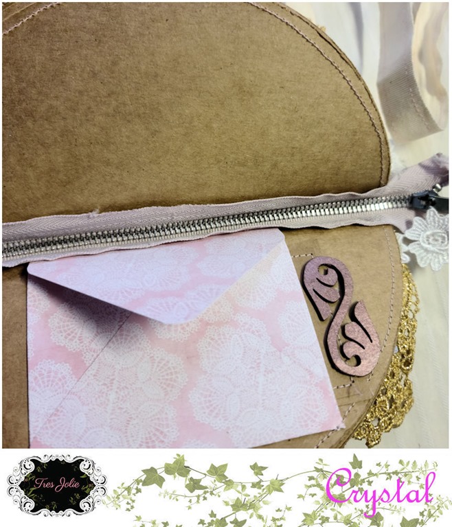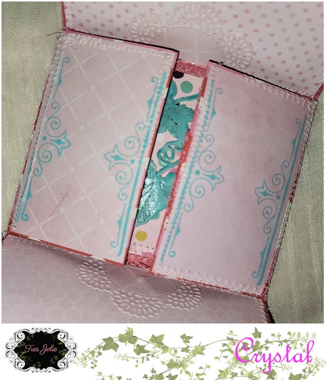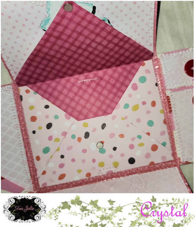 Here you can see the inside envelope, I added little magnets just to help keep the flap down. It wasn’t really necessary, I just found it helped keep the flap down for when I folded the album up. You can see I used the Altair Art papers from the kit to make my inside panels, with some doily’s added in that were made using the Dress My Craft Die from the kit.