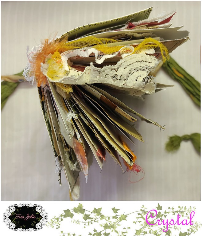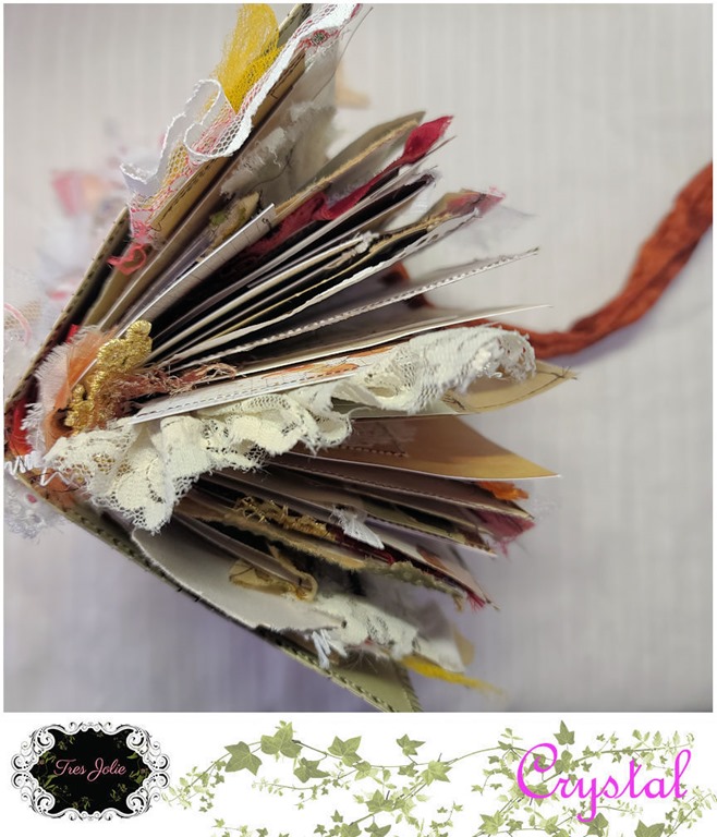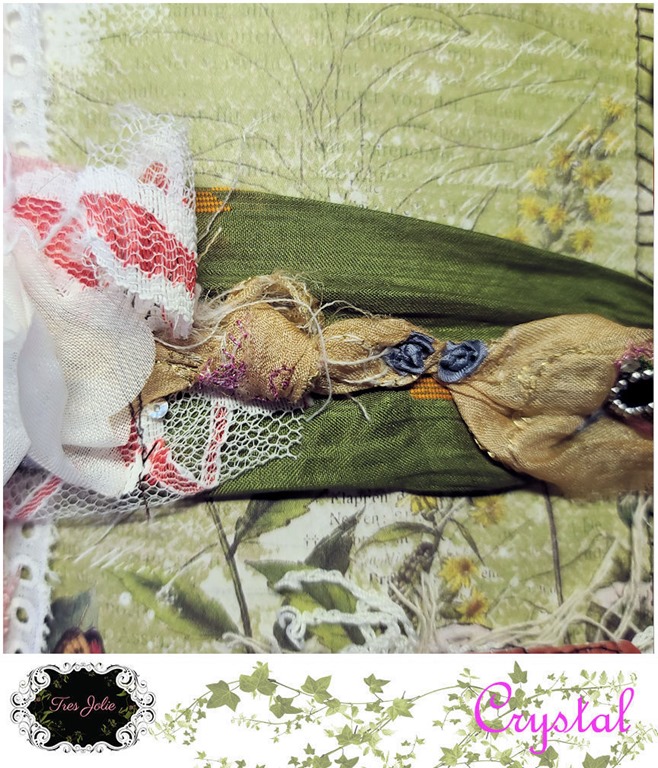 The closure for this journal is also made up of many layers. I used my silk ribbon flowers and knots to hold the sari silk in place to showcase the gem!