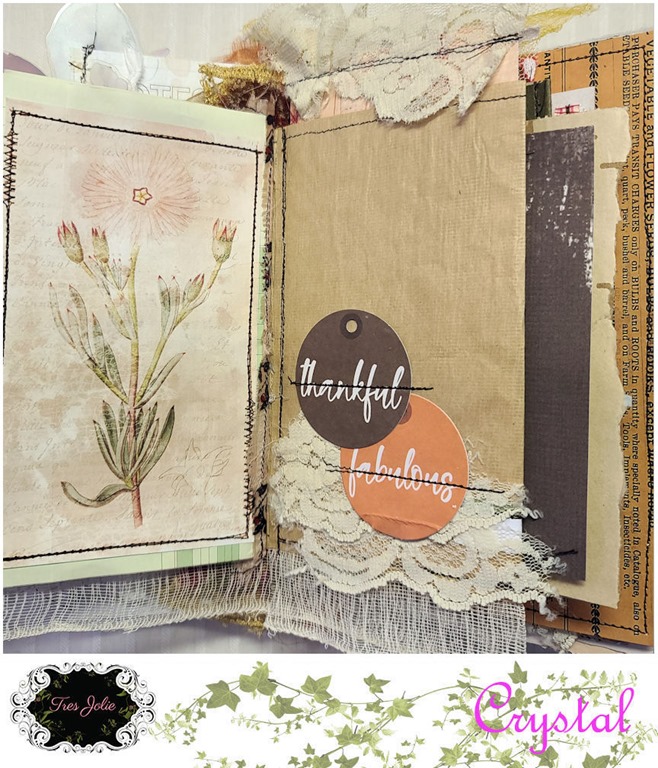 A sample page from the center of the book. I have some printables in the journals (left page) that I was gifted. Almost every page has some decoration stitched on like you see on the right page above—using ephemera, fabrics, and/or laces.