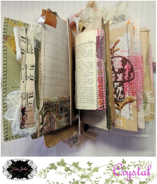 *Tres Jolie Chipboard Buttons; Recollections Value Pack Cards & Envelopes (5 in x 6.5 in cards; 5.25 in x 7.25 in envelopes); Sizzix: Big Shot Plus & Dot Embossing Folder; Sizzix/Tim Holtz Alterations: “Playing Games Set” Texture Trades, “Book Covers Set,” “Checkerboard,” & “Woodgrain” Texture Fades; We R Memory Keepers: Envelope Punch Board; EK Tools Scoreboard; green masking paper; tea dyed papers; manila folder; hanging folder; paper doilies (*one from previous kits); old book pages; sheet music; old newspaper I received in a swap from Monica!; various laces and trims (*the gold one from a previous kit, some from swaps with Wendy & some from Mel!); piano roll paper; sari silk; brown thread; Printable from Pink Monarch Prints I received as a gift in a swap with Monica!; LineCo 1.25” Linen Hinging Tape; Fabri-Tac; LineCo PVA Glue & Book Binding Cloth; Art Glitter Glue; UHU Stic; Elite Handheld Book Embosser & Tree Plate; 4mm Silk Ribbon; J&P Coats Embroidery Floss Col. 03051; awl; cream book binding twine (waxed)